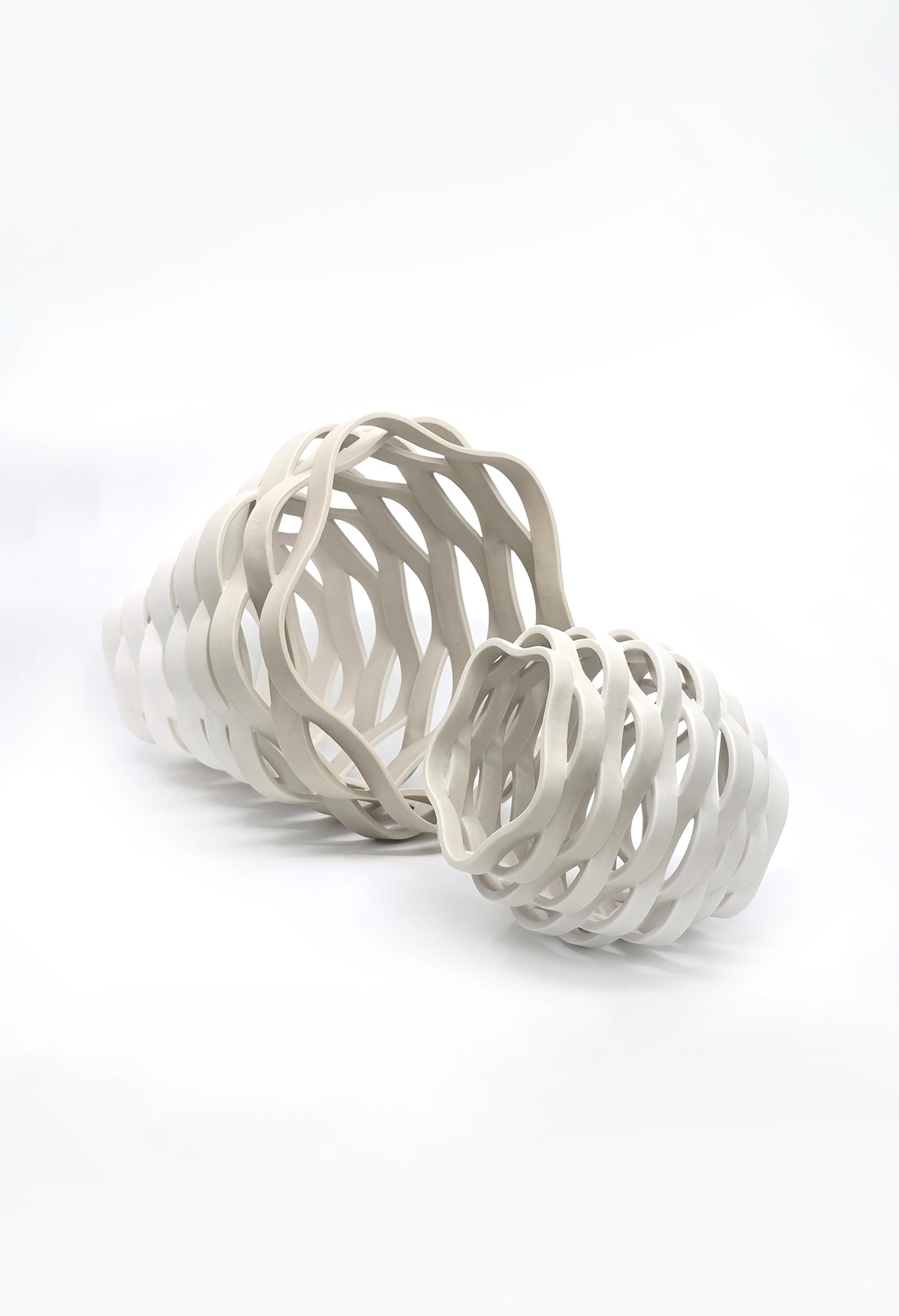 这件作品采用白色瓷土制成,表面呈现微妙的色彩渐变。通过精确的手工塑形与结构分层,器型化作精巧而稳固的格栅,让光线与空气得以穿透。作品由两个相连的器形构成,两端均呈开放状。这种开放结构暗示着呼吸的静谧韵律——内外之间轻柔流动的呼吸。表面色彩的渐变标志着从静止到运动的渐进过渡。作品隐喻诞生的瞬间——从封闭到独立的蜕变。较大器皿传递庇护感,较小器皿则象征仍栖居于此的新生命。其核心意象在于:呼吸作为身体与世界初始的联结,以及承托这份开端的结构性空间。
