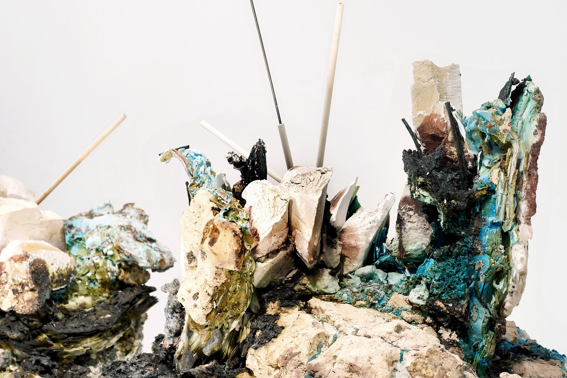 “Massafra”通过原始而不规则的形态唤起人们对岩石、矿物和工业遗迹的联想,这些形态似乎承载着时间的印迹。其表面让人联想到地质构造、化石和考古遗物;裂缝与断层象征着地壳的运动,反映出塑造我们星球的张力与冲突。这些抽象的形态描绘出未来的图景——自然与人类需要建立新的平衡。通过陶瓷与铁质材料、氧化物和釉料的组合堆叠,经过时间沉淀,产生出前所未有的结构。创作如同考古层序,材料在时间中重叠与沉淀,创造出一种物质的沉积记忆。一种新的“自然”形态开始占据主导地位:形状与空间赋予作品生命,布满了结痂状结构和物质上的变化。这些形态变得锋利,仿佛峭壁的锯齿边缘,岩石般的表面仿佛古老的石化“方舟”——一个未来的诺亚方舟。 这一形象暗喻着人类希望调和自然与文明的力量,提醒人类与自然脱节所带来的危险。在宇宙的浩瀚面前,这件作品引导我们思考人类的渺小,以及尊重地球资源的必要性,唤醒我们重新关注地球与人类的关系。其中出现的碎片让人想起当代城市的遗迹:破碎的形态如同“城市遗物”从地面升起,如同世末考古学,描述着荒漠般的场景。这件作品引发我们重新审视自我,打开新的世界。