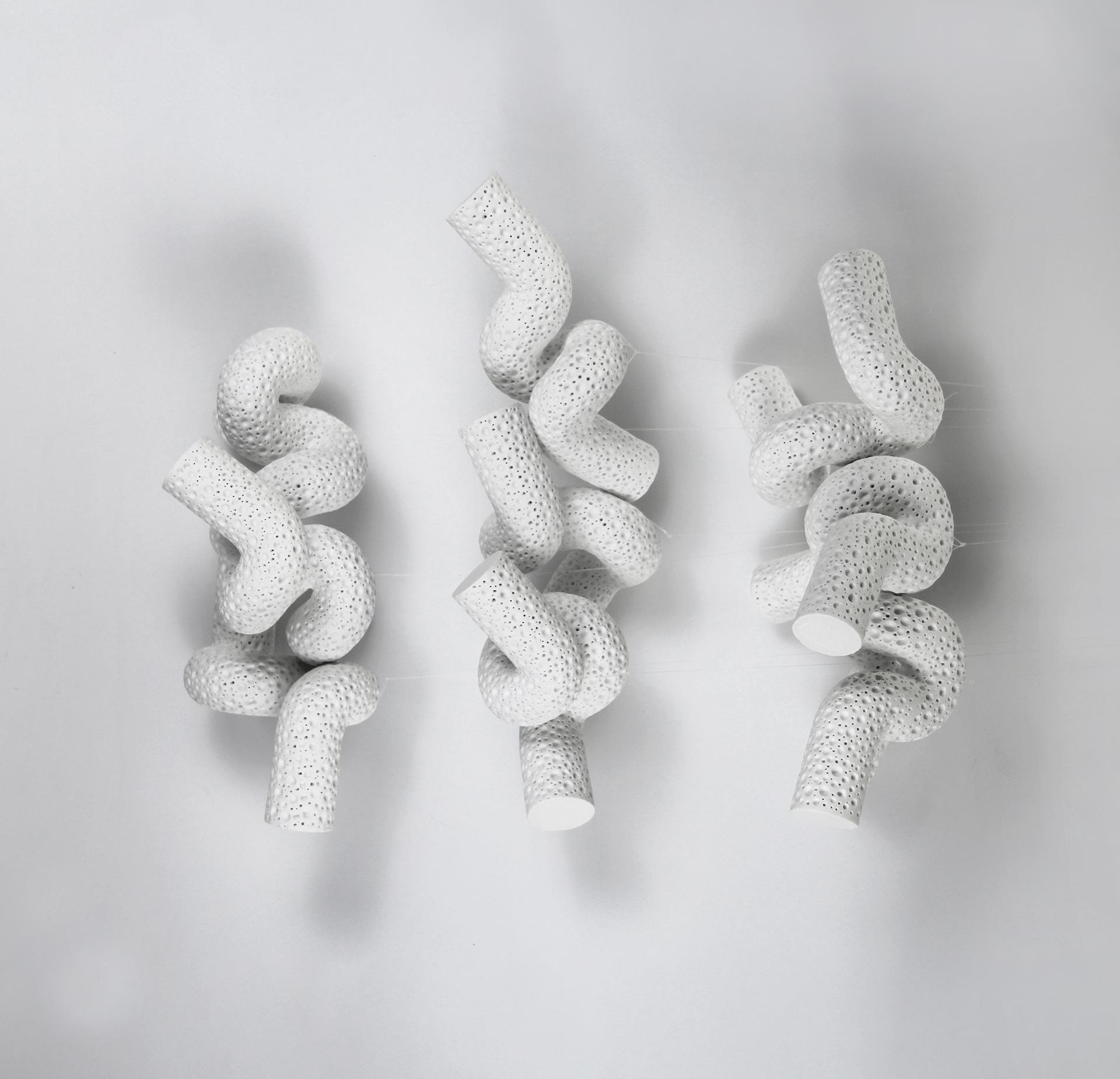 这是一组漂浮于空中的瓷之节奏。由德化白瓷制成的弯曲管状体,像是被时间揉皱的气流,亦或是未被命名的生物,游弋于无声的空间之中。肌理如海洋微生物般繁复密布,诉说着内在的秩序与混沌的边界。 在静默中,它们彼此回应、轻盈旋舞,像是一场无言的思想流动,也似是对生命形态的冥想——无始无终,无名无状。它们既似断裂的连接,也似从未分离的整体,悬于可感与不可感之间,轻轻拂动我们对存在的感知。