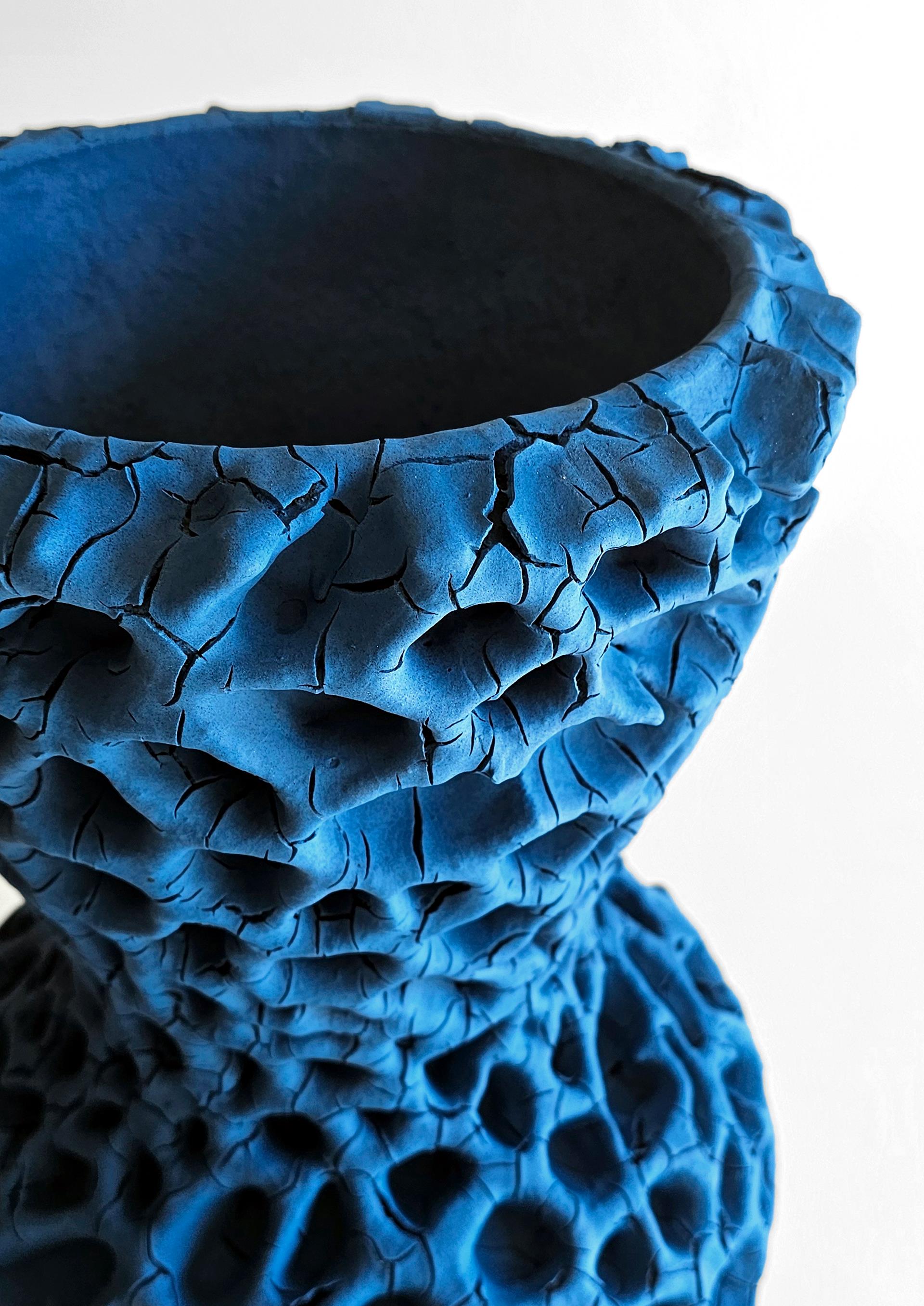 在这件作品中,我想将我长期实验的珊瑚状表面工艺与当代形态相融合,成为一件具有鲜明特点的器皿。我希望这件作品兼具设计感与破败感,同时又有自然、原始的特质——它们在诉说美与遗忘时,以同样的力度低语着永恒。器皿在陶轮上拉坯成型,采用石器与瓷土混合材质进行雕塑塑形。珊瑚纹样经拼接与精修后施加于器身,经1240摄氏度高温烧制后,反复浸入浓稠瓷釉中,再经1240摄氏度二次烧制。最终色泽源于釉下彩喷涂工艺,需经多次烧制方能定色