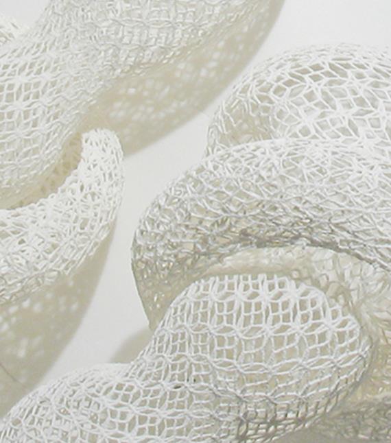 作品《影子的白色守护者》以巨大、不太稳定的花瓶和圆盘为支撑,花瓶内和圆盘上摆放着有机网格体。这些网状结构使用废弃的女式网状紧身衣制成,这让我有机会去探索瓷器作为一种珍稀材料的脆弱性。