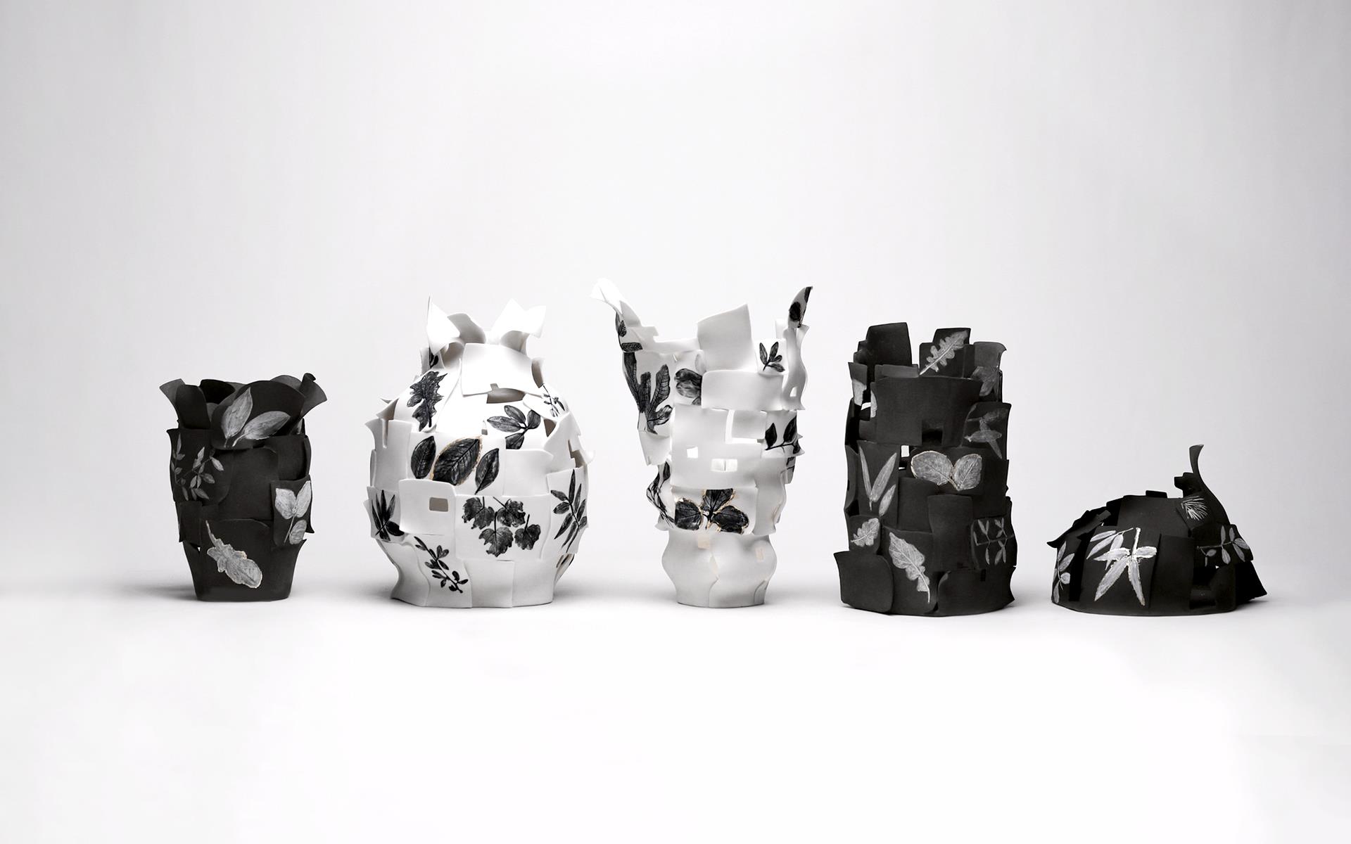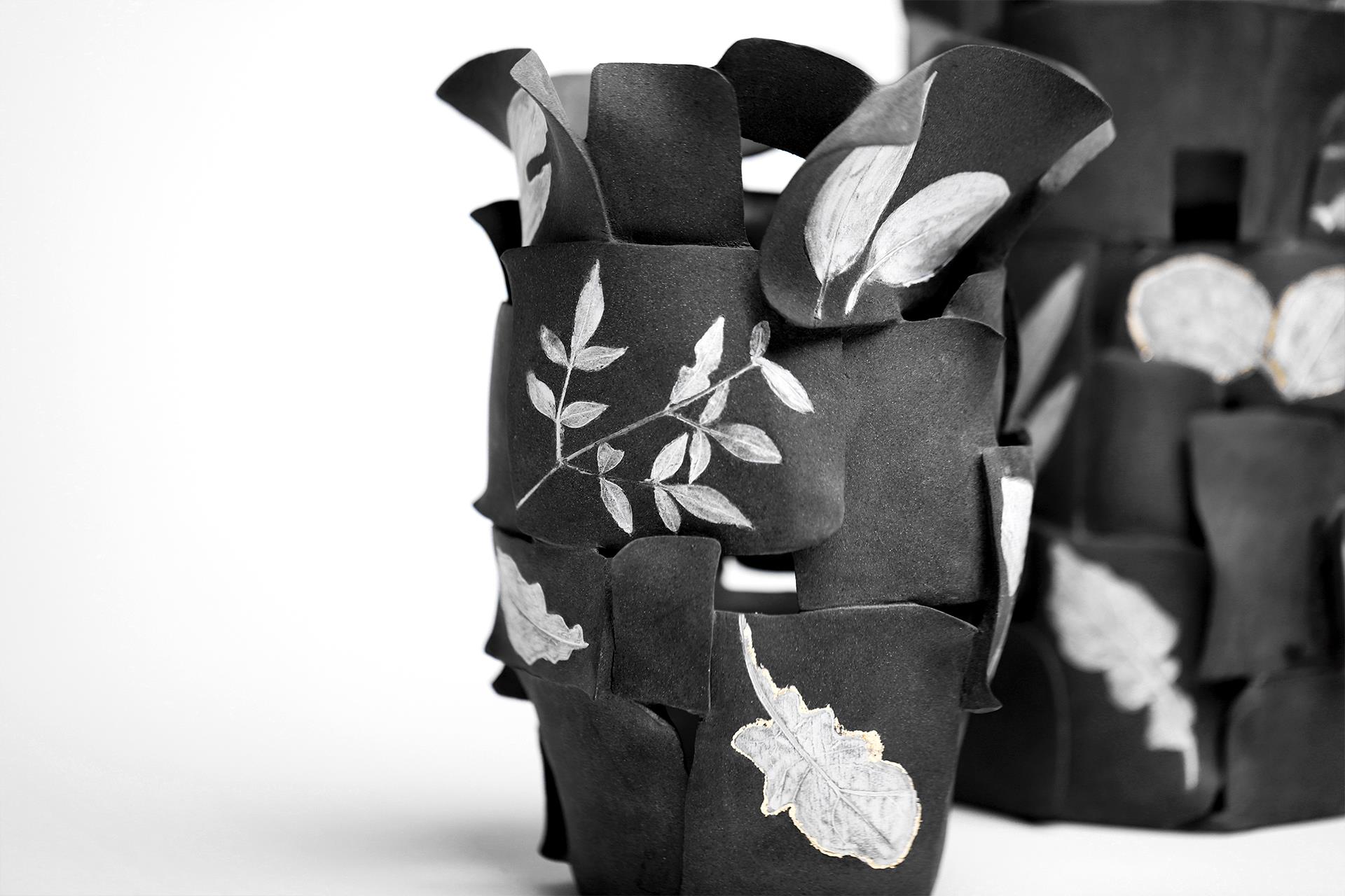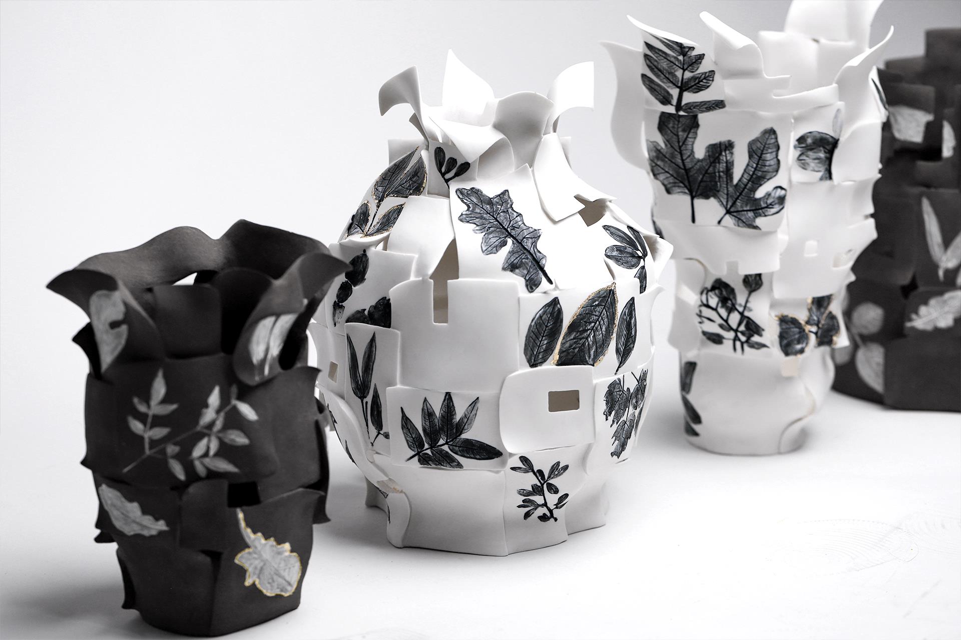 作品结合传统陶瓷器皿造型同时进行重组再设计,通过“片面”构成叙事空间,融入光影交互技术将东方美学与现代设计相融合,并尝试运用水墨画色彩体系与植物拓印工艺打破装饰的桎梏,使作品在光影与陶瓷营造的氛围中获得与观者最佳交流方式,通过黑与白的视觉对立、材料与光线之间的明暗互动来表述在虚实之间见天地,于简素之中藏乾坤般的东方美学,试图使观者沉侵其中感受内心与自然的共鸣。作品希望通过作品的构图、造型、色彩、光影四点的协同运用来表现自然力,给人以沉静之感,营造审美与情感的统一。