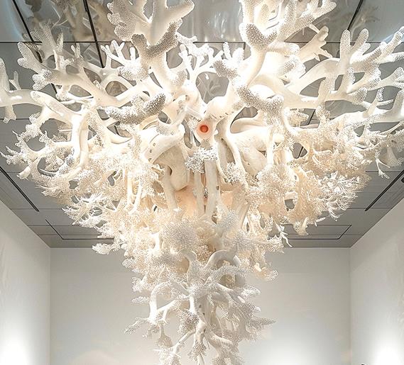 珊瑚象征着生命的蓬勃发展和自然的多样性,以悬浮的方式意在呼唤人们关注海洋生态环境,反思人类活动对自然的影响。