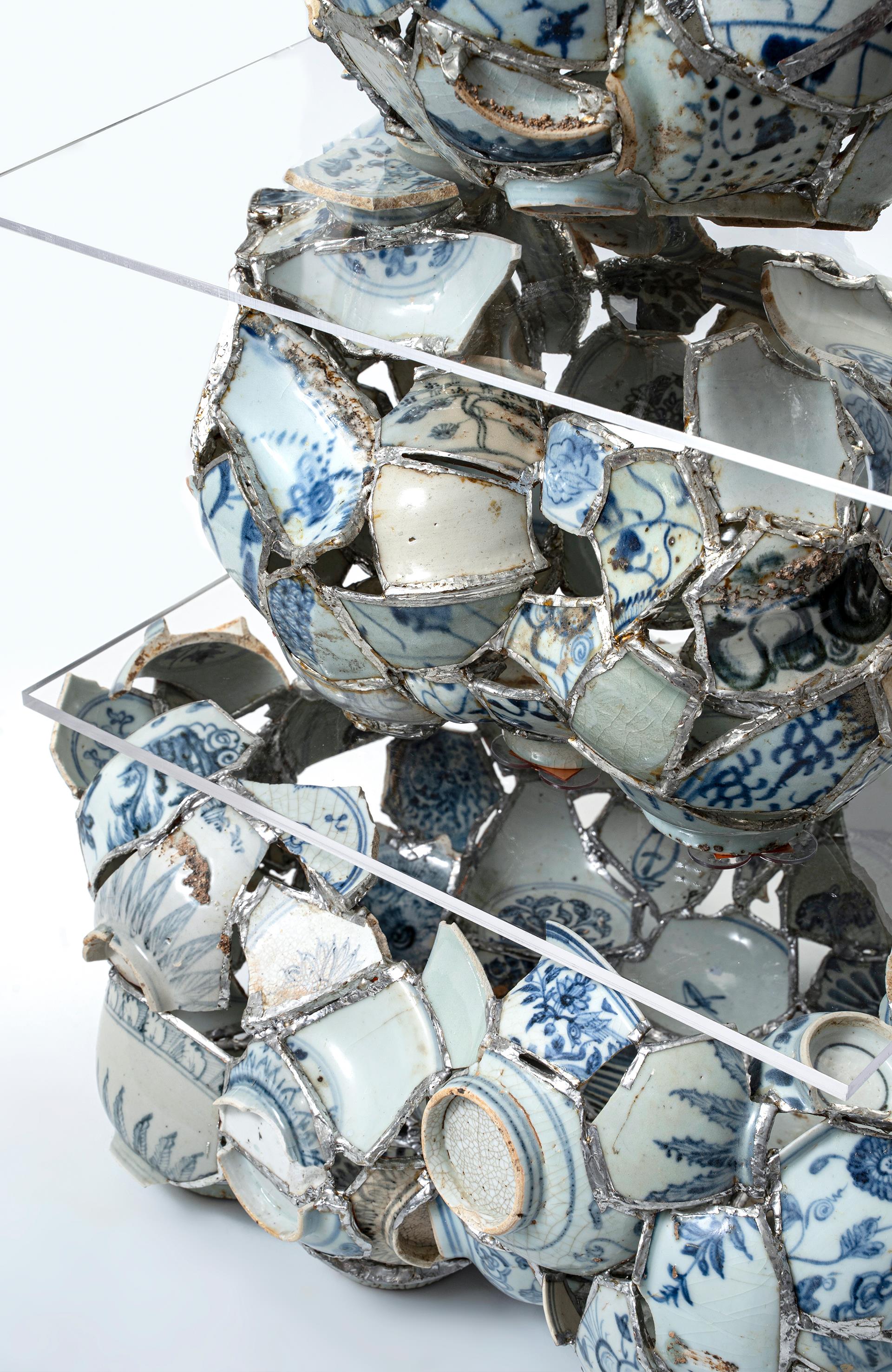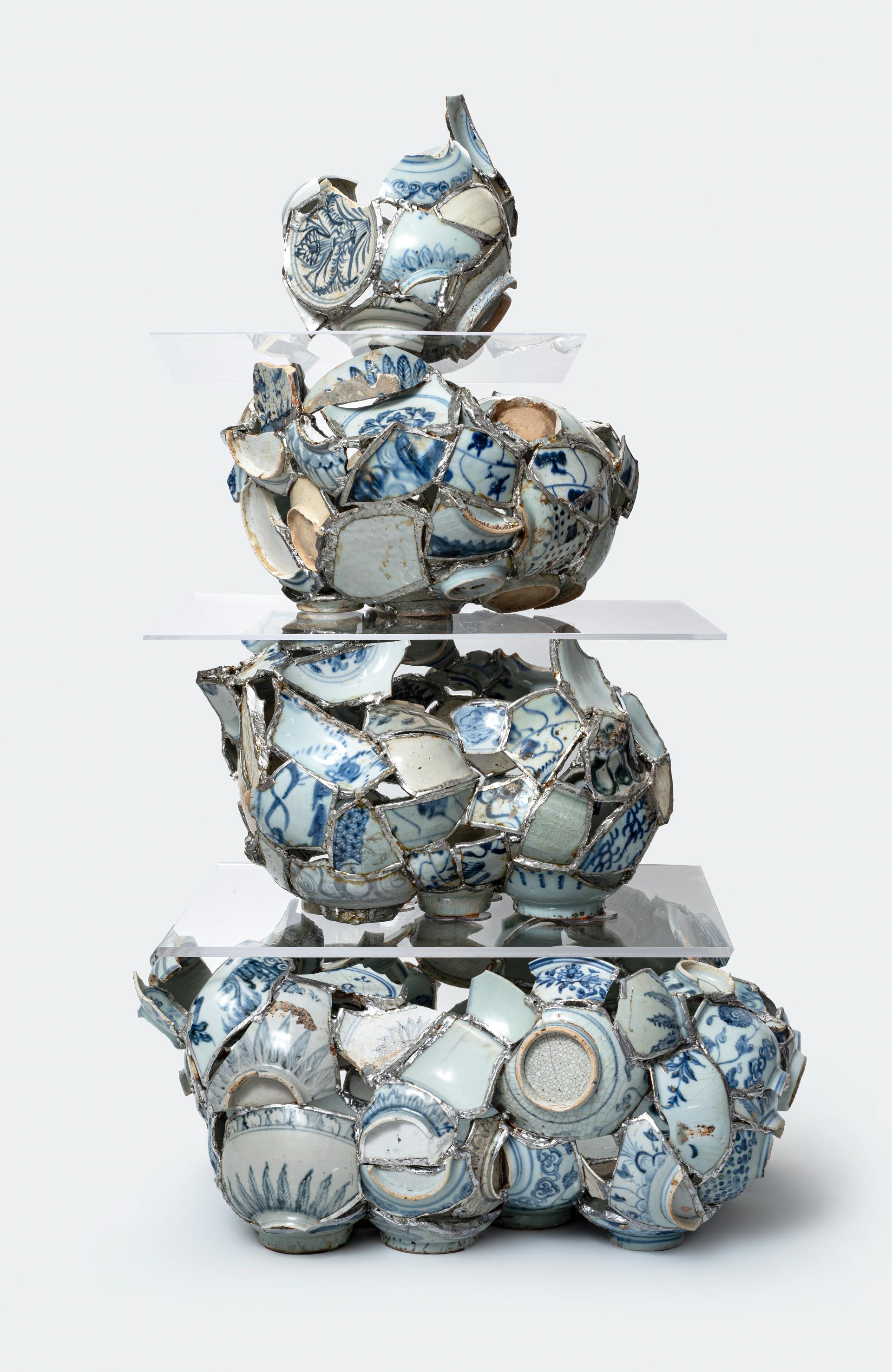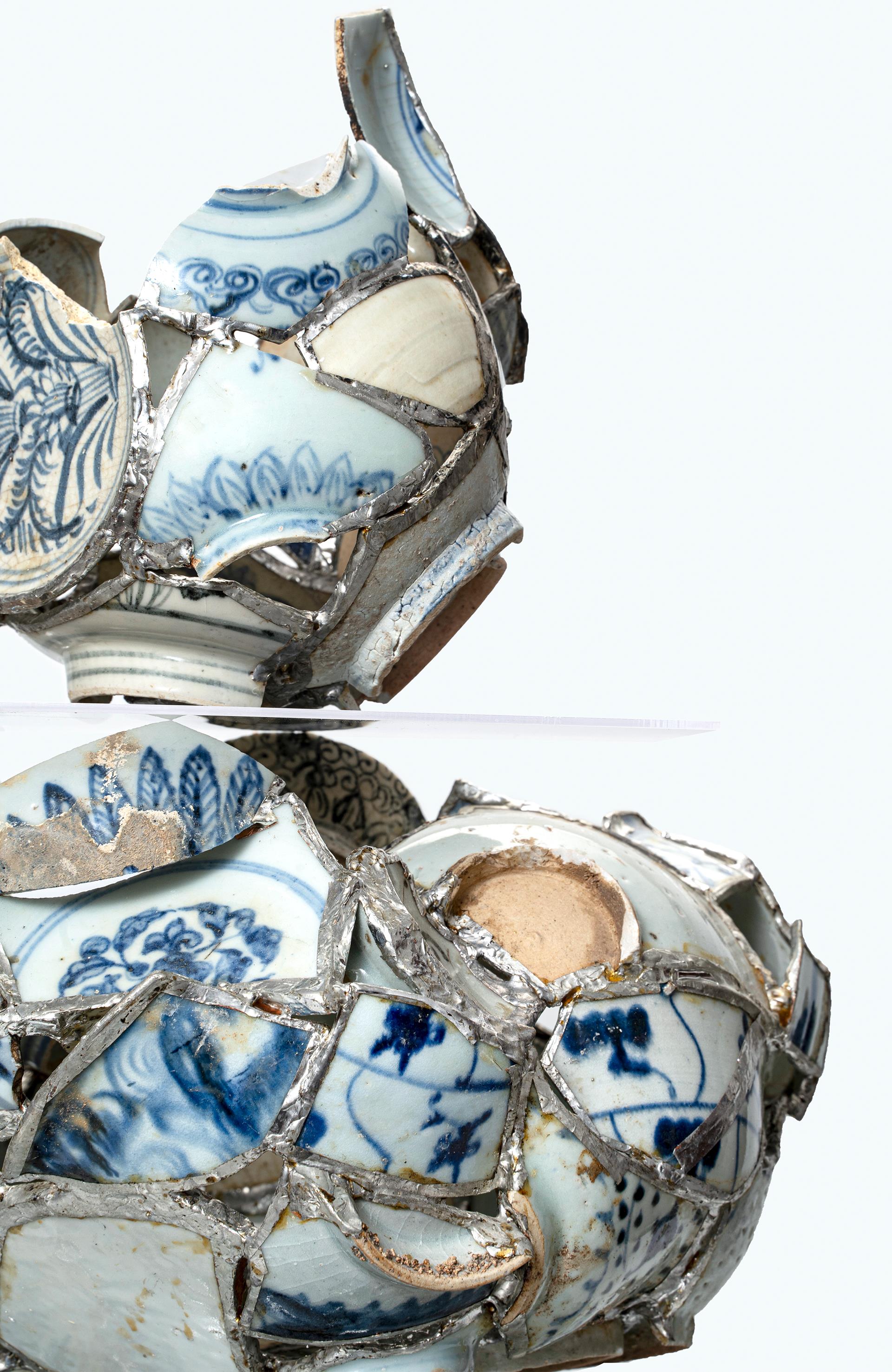 《文化拼图--片语·景德镇 本作品以景德镇古瓷片为载体,通过传统青花瓷的纹样与历史沉淀,拼接出一幅跨越时空的文化画卷。每一块瓷片皆源自元、明、清时期,它们曾见证过历史的变迁与技艺的传承。本作品将这些历经沧桑的碎片进行拆解、重组与焊接,形成一种看似随机却暗藏逻辑的艺术结构,仿佛在诉说一段断裂而又连续的文化片语。 “文化拼图”寓意在于将破碎的瓷片重新组合,构筑起完整的文化语境,表现出传统工艺在现代审美下的再生与革新。“片语”则赋予作品一种诗意的语言感,每一块瓷片不仅仅是物质的存在,更承载着历史记忆与地域文化,传达陶瓷传奇和文化底蕴。利用玻璃焊接技术,作品在形成了不同材质的碰撞与融合彰显了技术与艺术的交汇创新。作品试图以碎片的再生隐喻文化记忆的传承,展现当代艺术家在全球化语境下对传统工艺、地域文化和时代精神的深度思考。