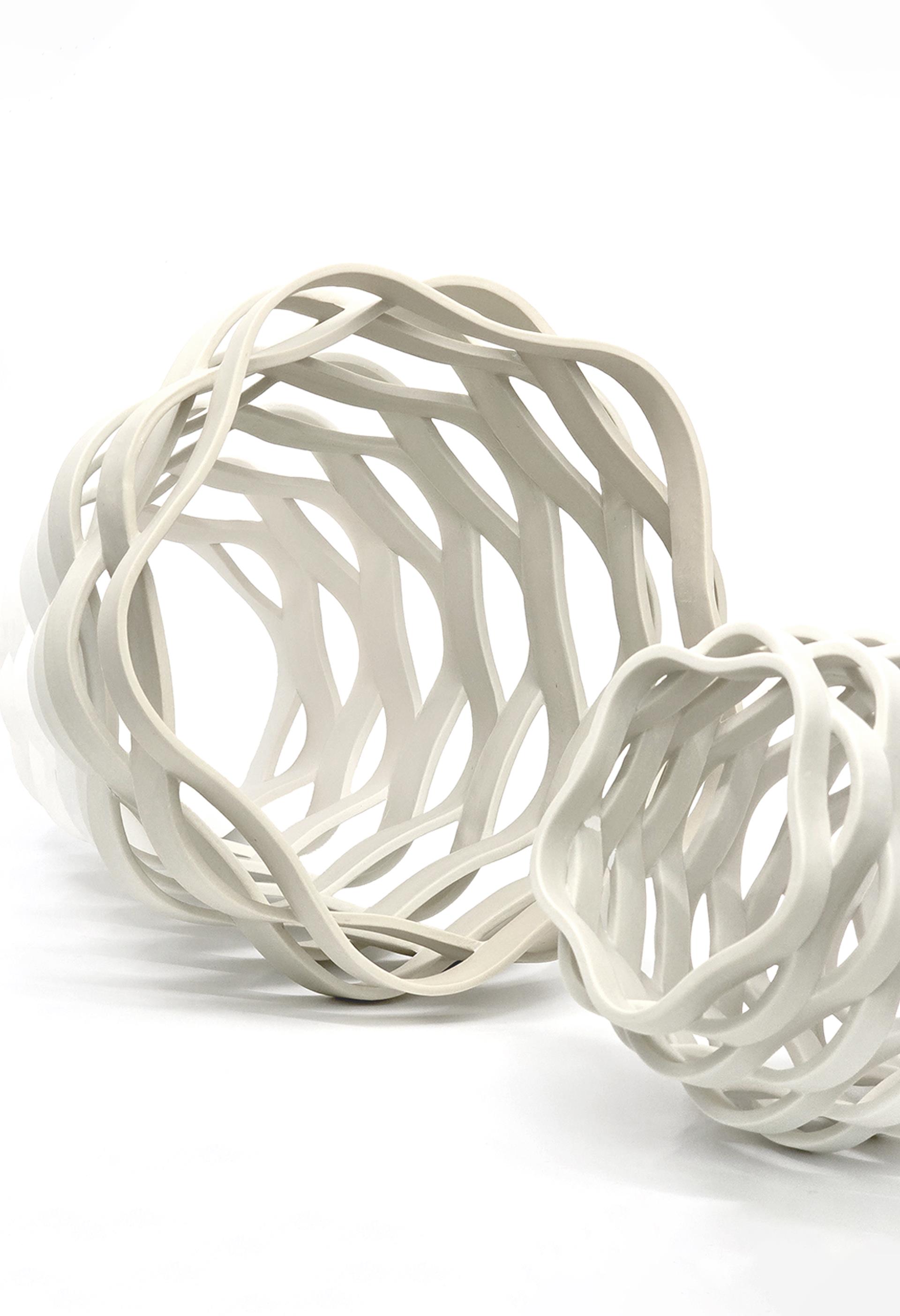 这件作品采用白色瓷土制成,表面呈现微妙的色彩渐变。通过精确的手工塑形与结构分层,器型化作精巧而稳固的格栅,让光线与空气得以穿透。作品由两个相连的器形构成,两端均呈开放状。这种开放结构暗示着呼吸的静谧韵律——内外之间轻柔流动的呼吸。表面色彩的渐变标志着从静止到运动的渐进过渡。作品隐喻诞生的瞬间——从封闭到独立的蜕变。较大器皿传递庇护感,较小器皿则象征仍栖居于此的新生命。其核心意象在于:呼吸作为身体与世界初始的联结,以及承托这份开端的结构性空间。