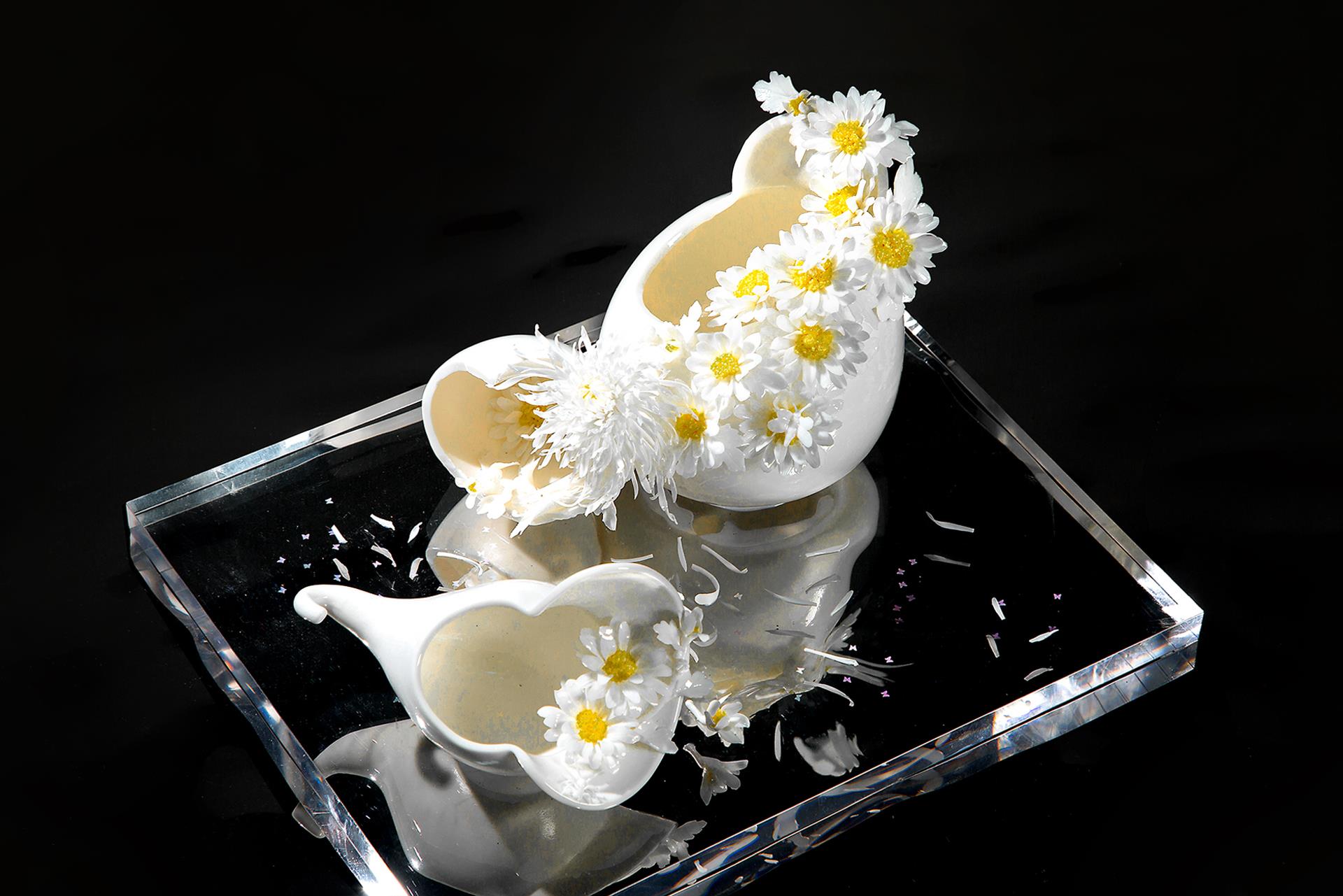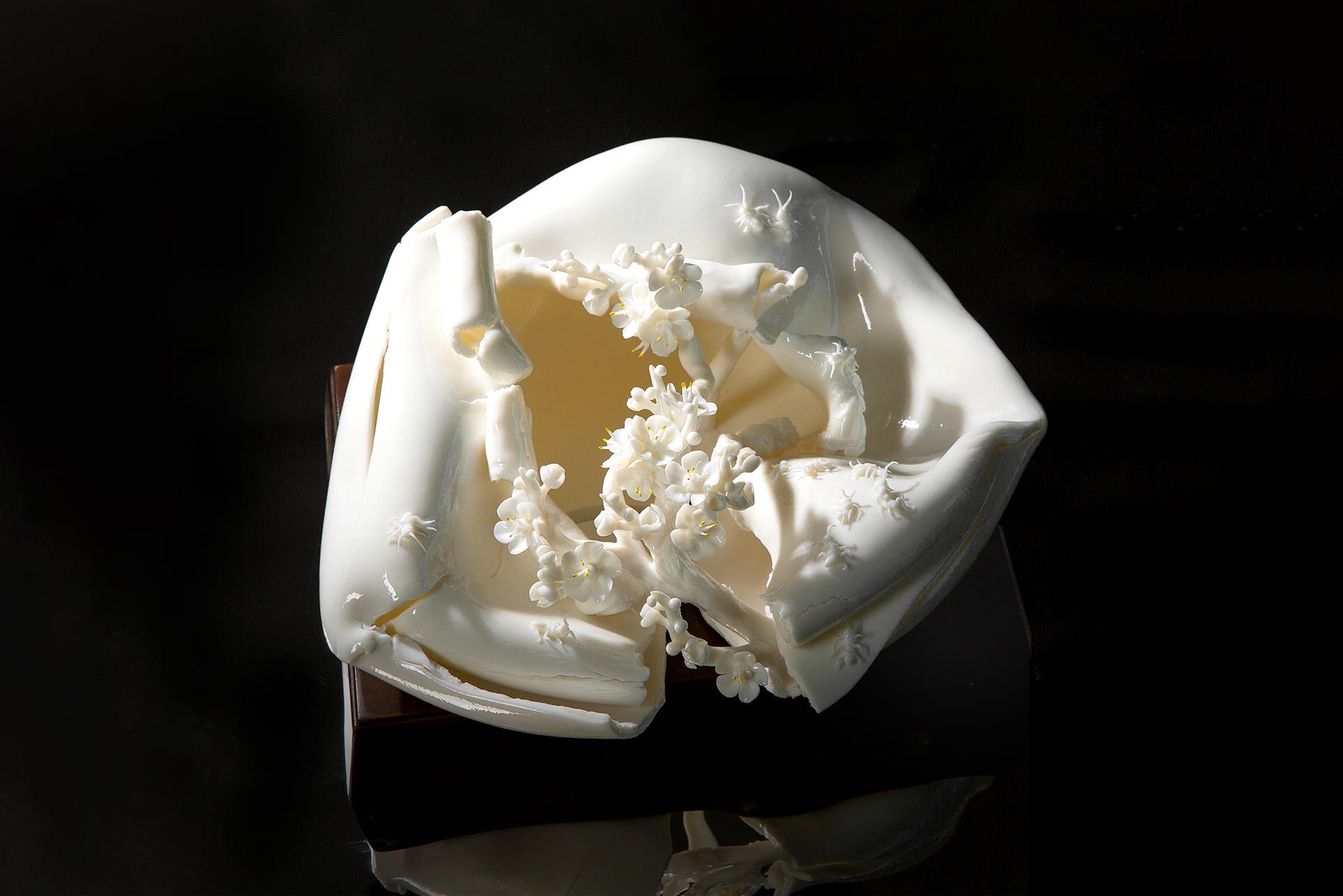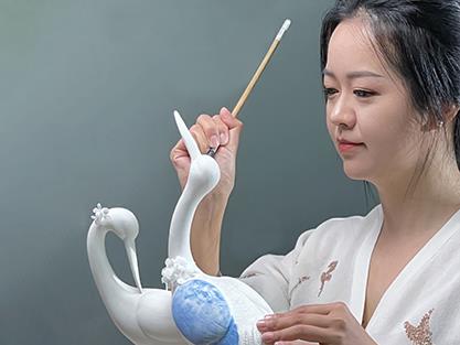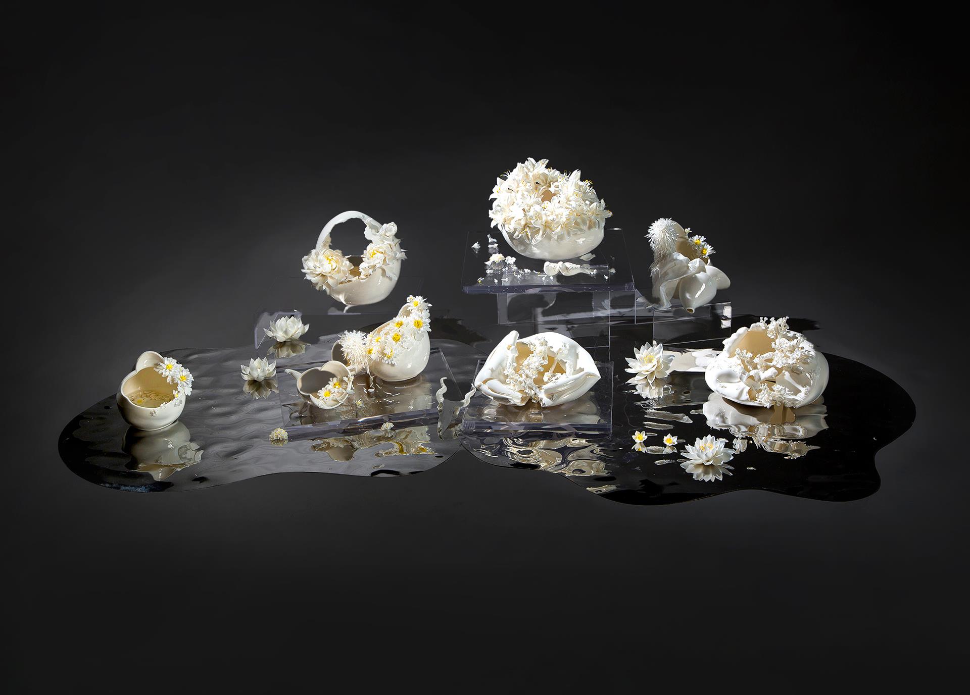 《生命系列·絮语》创意设计旨在以陶瓷艺术诠释自然生命的共生之美,传统的工艺美术及捏塑。以凋零之声传递生命循环,一年四季开花结果以各种捏花造型的花朵做各种变化,蚂蚁沿迹攀行,构成能量流动的微观网络。纯白底色隐喻生命的纯粹本真,底座以水波纹的投影技术投射涟漪光纹,虚影与实体陶瓷形成‘水下倒影’的幻境,既呼应水润万物的生命之源,又以光影重构传统器物的空间叙事。似乎也映射出当代人对生活的反思。