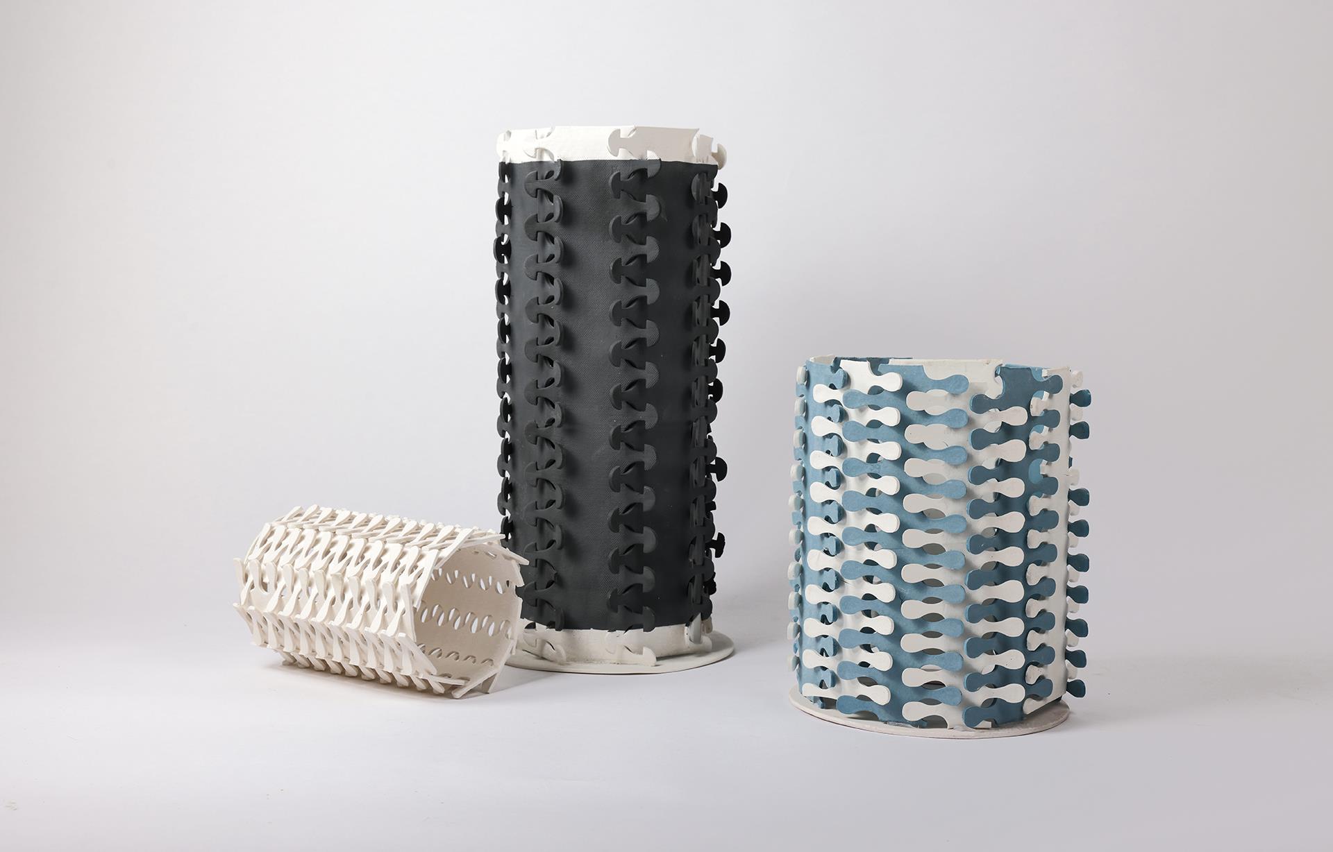 《织脊》围绕“骨骼”与“编织”的双重隐喻展开创作。将自然界脊椎骨的节段性、叶脉的脉络性,转译为陶瓷模块化结构,并通过重复拼接与环形缠绕,模拟生命体中结构性支撑与柔性连接的共生关系。