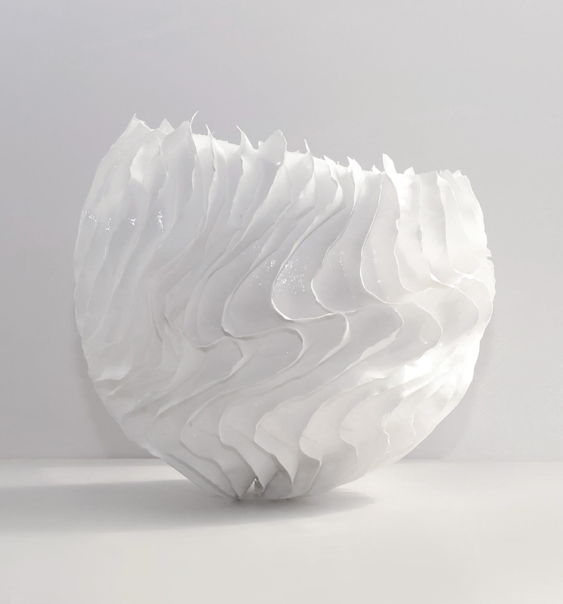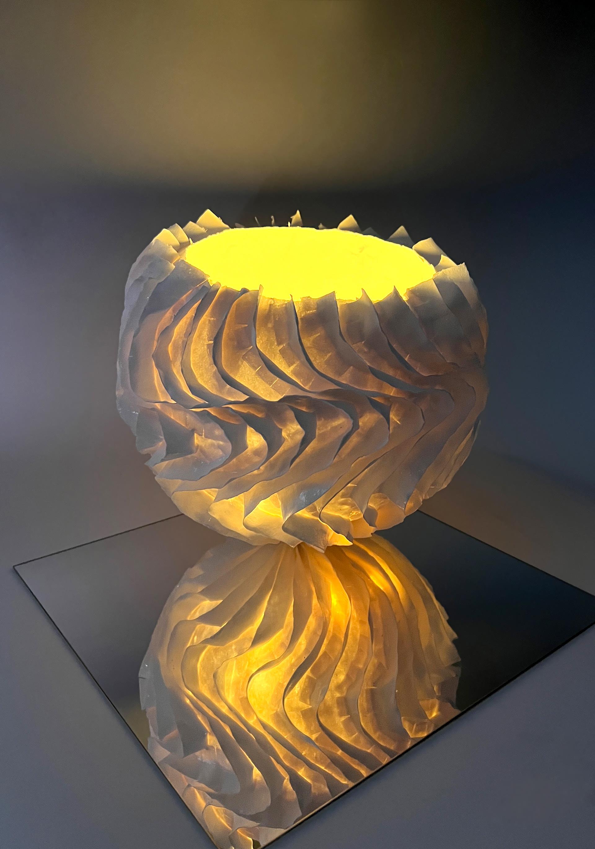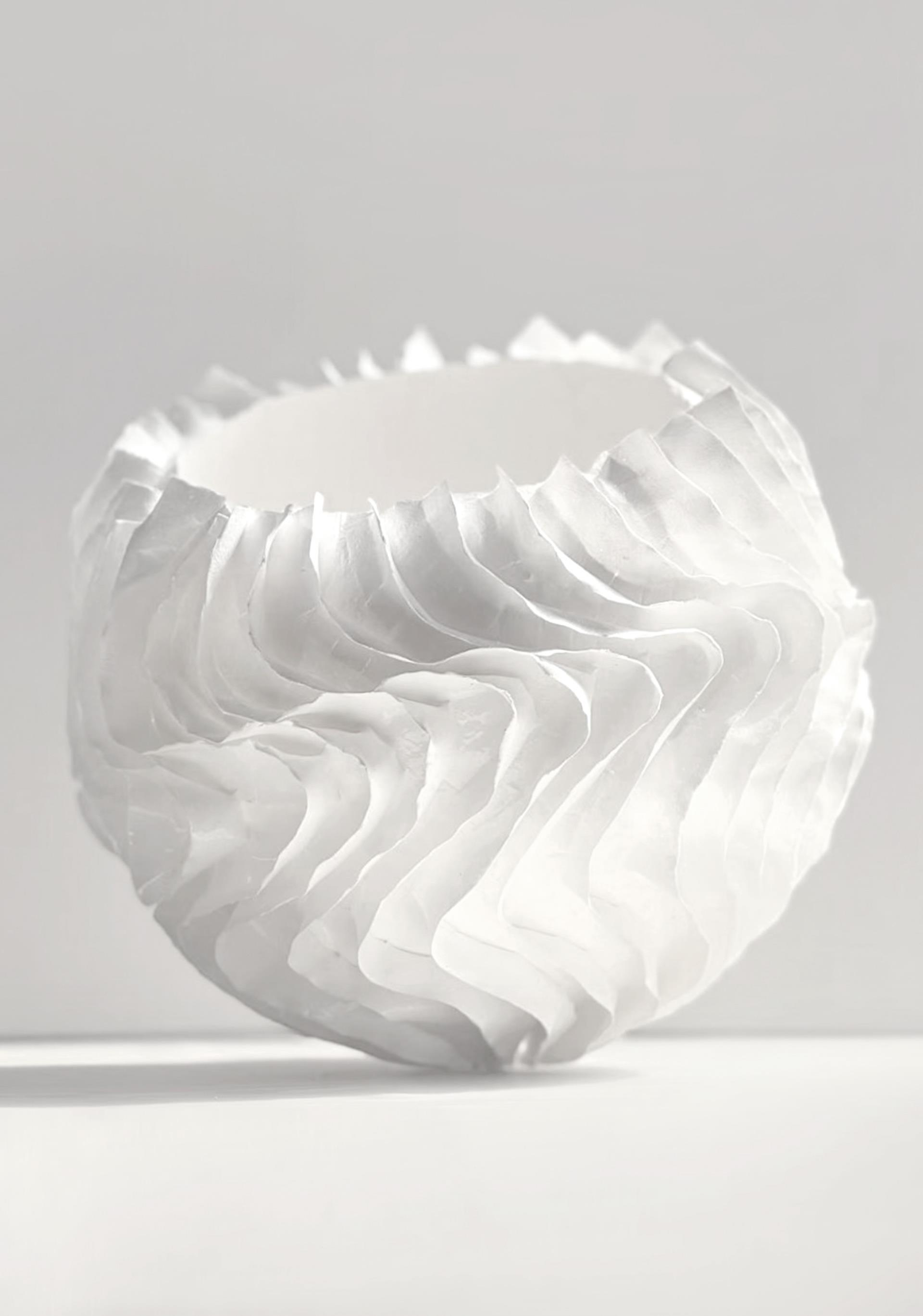 水纹样是中国历史上最早出现的纹样之一,水纹样之所以最早出现并稳定发 展是因为“水生人,水生天地万物 ”的观念,古人依水而居,依赖江河湖海的水 资源和物产资源而生,自然对水产生了无限的崇拜,从而影响着他们的认知和审 美观念。马家窑彩陶文化中的漩涡纹、波浪纹是水纹样发展过程中的翘楚。 本作品《浮光·波影》以马家窑彩陶文化中的漩涡纹和波浪纹为视觉语言的起点,运用薄胎瓷为主要表现形式,对其进行再设计,将这两种纹样从以抽象线条为主的二维平面转化为三维立体的曲面结构,结合内部与外部光源 的运用,通过波浪的造型语言模拟水的律动和漩涡的张力,在表达对水、自然与生命崇拜的基础母题上,展开对“流动与静止 ”以及“光影与感知 ”的艺术探索。作品不仅是对水的自然意象的视觉重构,更是对中国传统符号进行当代表达和创作转化的尝试,力图通过这两个主题呈现出作品在形式与材料上的创新以及作者对于自然的崇拜、变化与感知的思考。