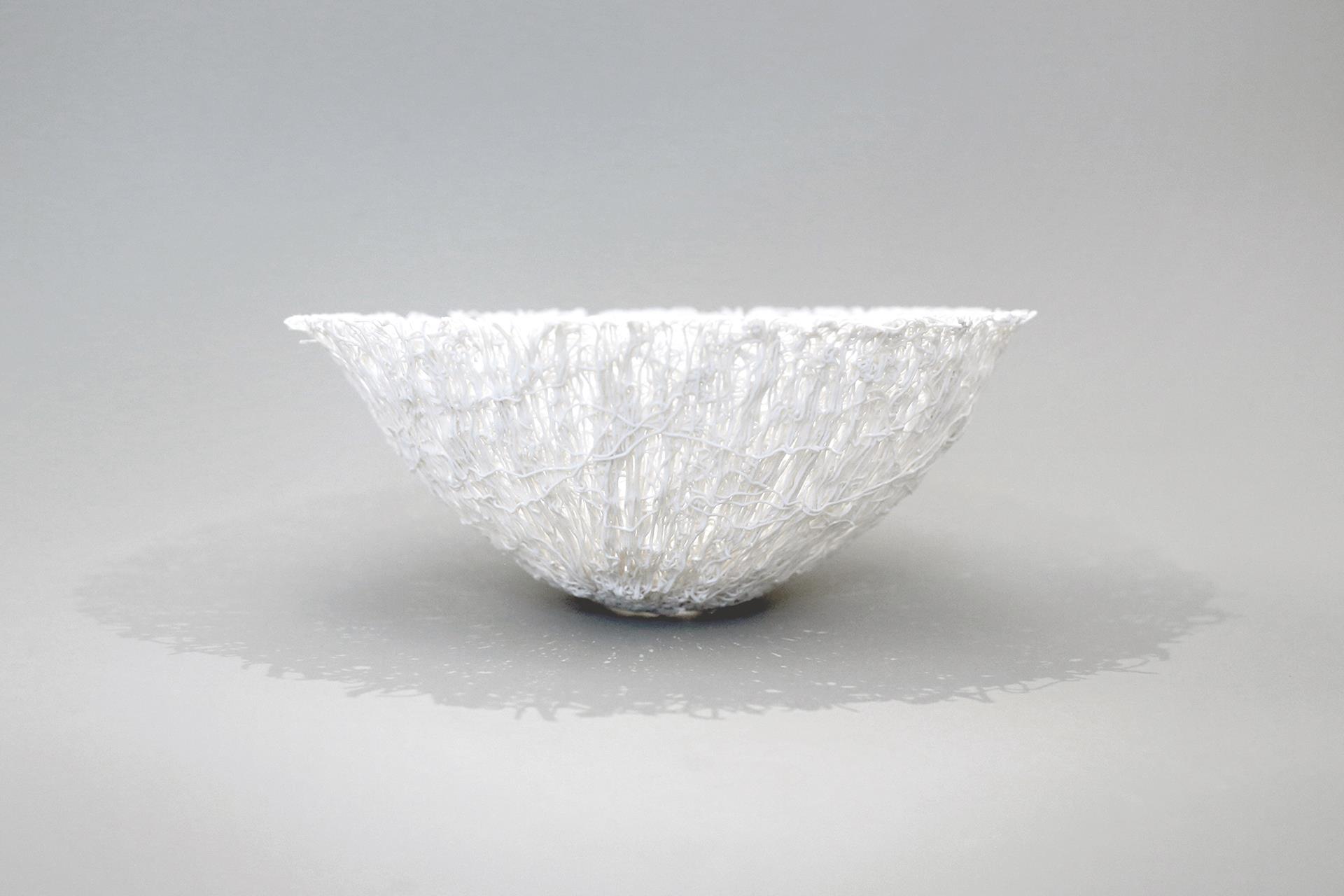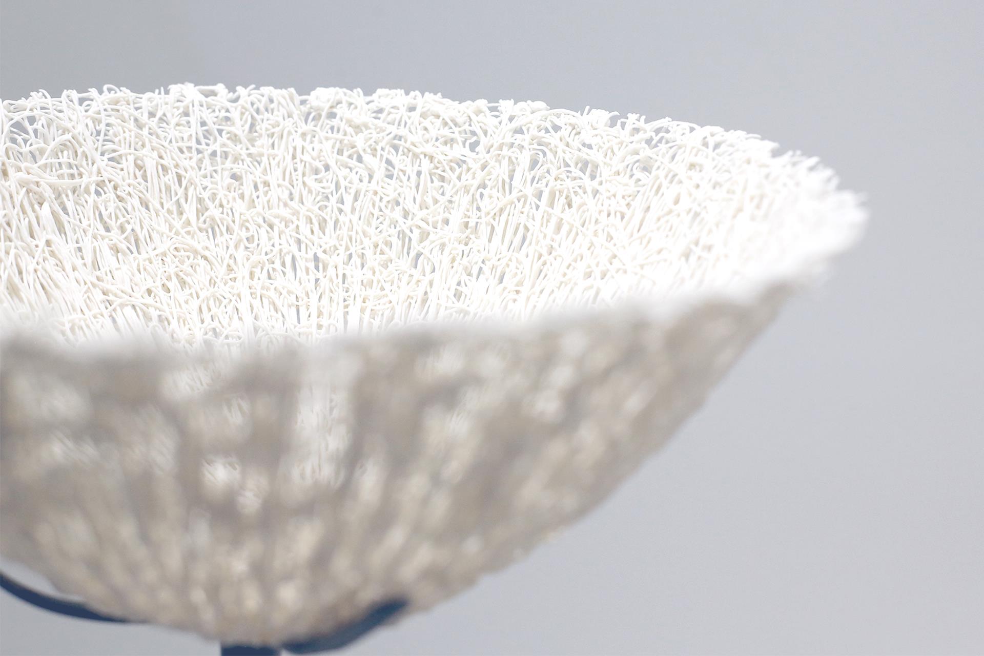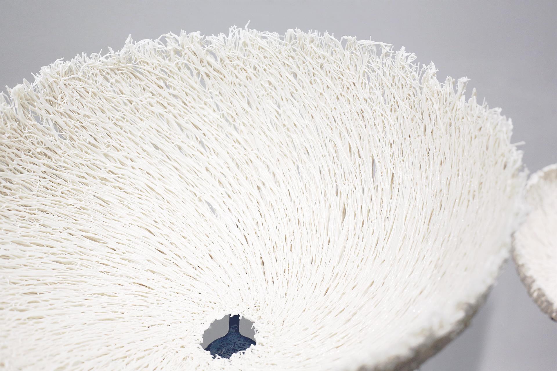 本作品灵感源自蘑菇珊瑚的化石形态,以线条律动与半圆结构回应自然生长的秩序与节奏。通过陶瓷这一人造媒介重构自然遗迹,使自然的痕迹得以在当代语境中延续与共鸣。