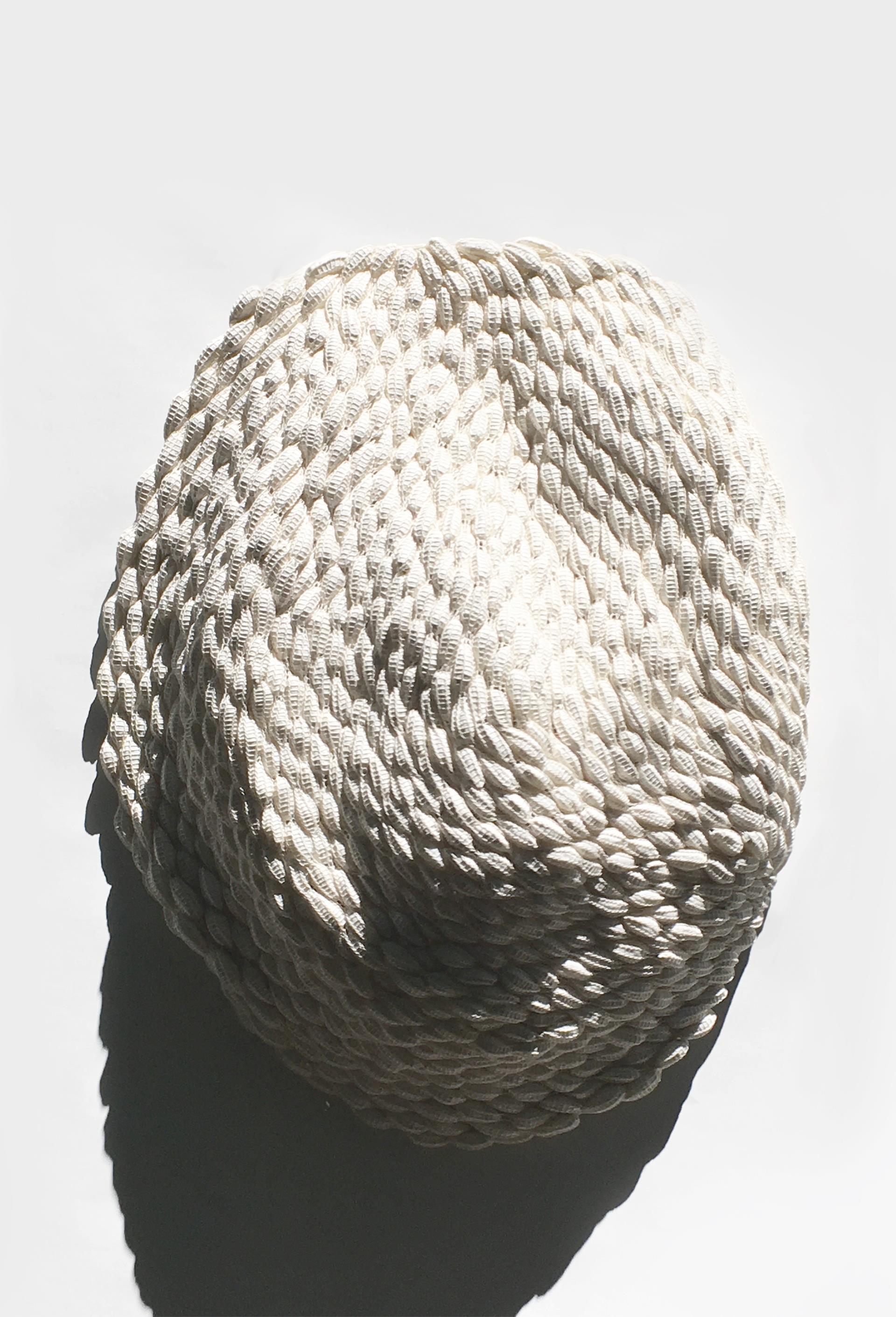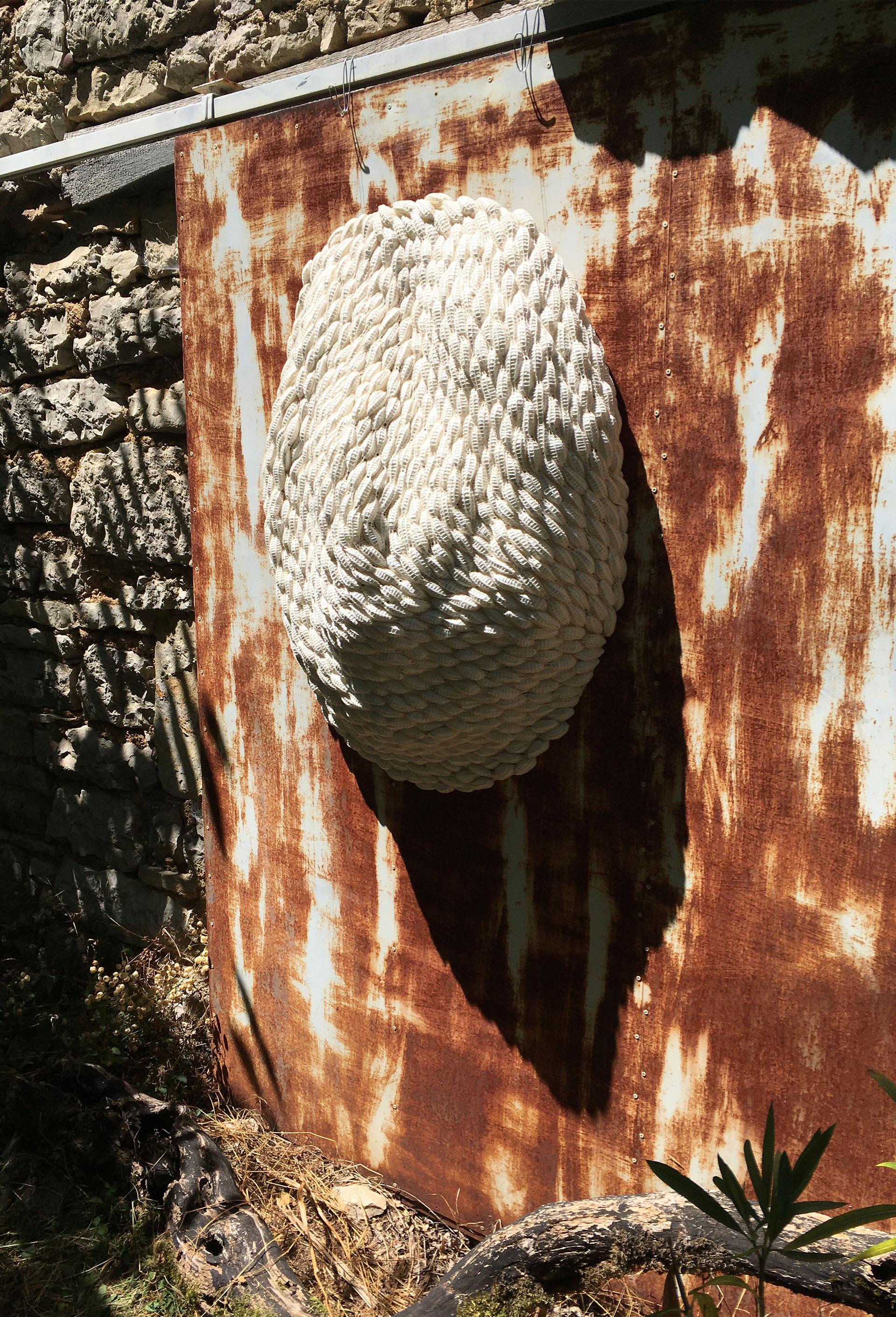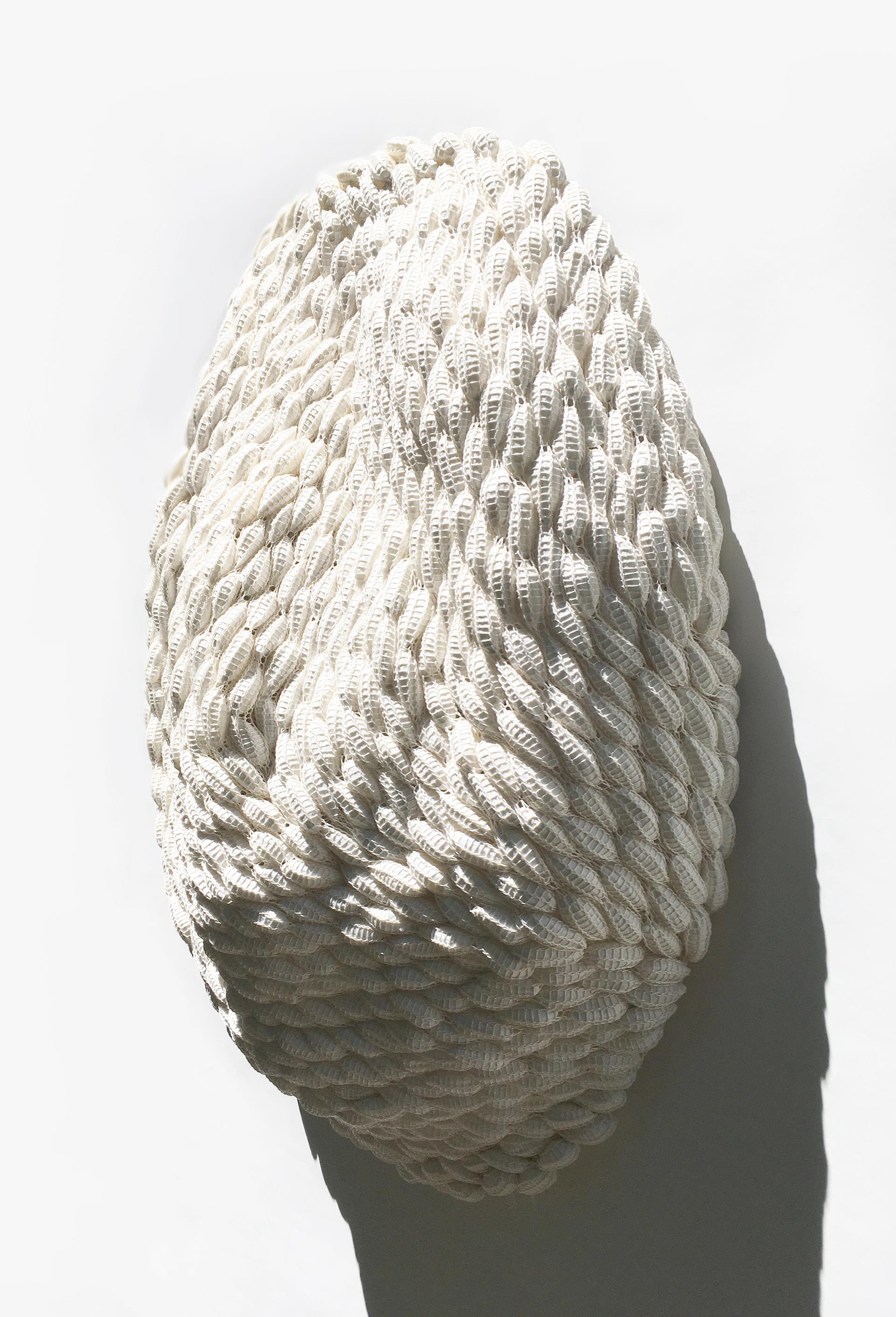 《敏》 是一款瓷质颗粒浮雕,将半透明的瓷质颗粒与轻盈的丝光棉编织绳结合在一起,创造出质感与光线间的微妙的互动。这些瓷质颗粒小巧(约高 4-4'5 厘米 x 宽 1.5-2 厘米)且非常轻,由瓷釉浸渍羊毛工艺逐一制做。将粗梳羊毛线浸入液态瓷浆中,泥浆自然地堆积在毛尖,形成蚕茧般纤薄的膜片,修正后置于1260度电窑中烧制,最终只剩下极其纤细的瓷,其质感精细,似枯叶飘落。这种技法突破并重塑了瓷器精妙与通透的边界。最终,这些瓷粒由一根轻盈的手工编织细绳连接,精心缝制在金属线编织的细密网格上。这种创新方法探索了密度与轻盈之间的微妙互动。可持续性是我艺术创作的核心。我只使用天然的本地材料,并设计出最大限度减少原材料消耗、仅留下极少量可降解废弃物的工艺流程。每件作品均在自然光下手工制作,并使用本地可再生能源烧制,这种创作实践根植于生态环保意识。
