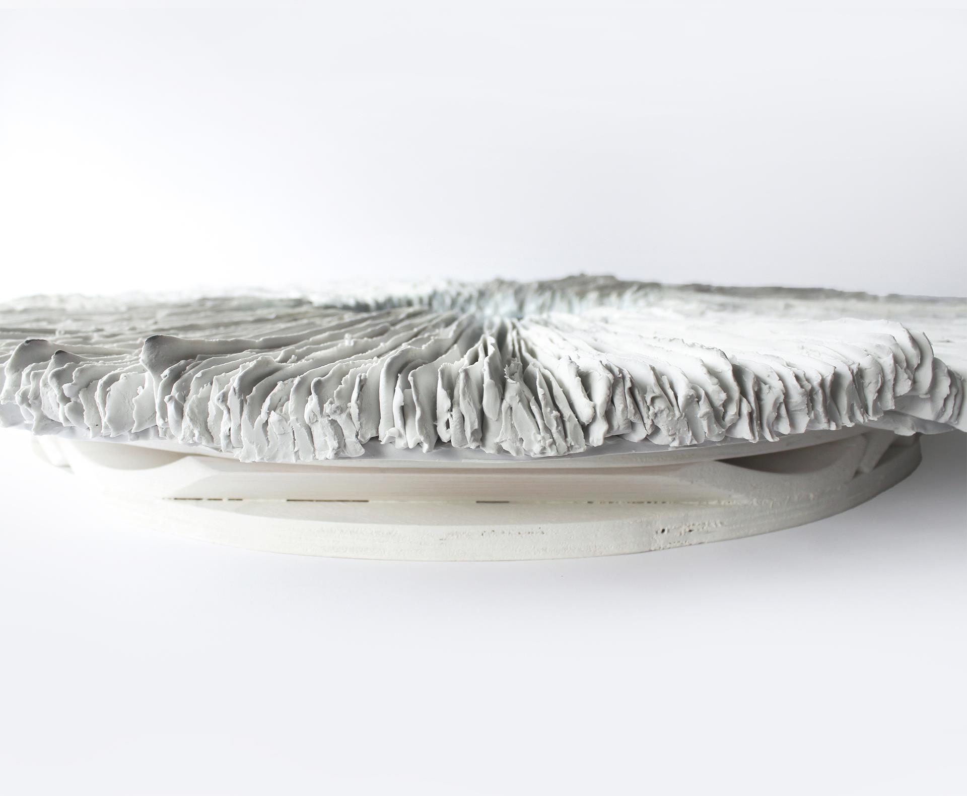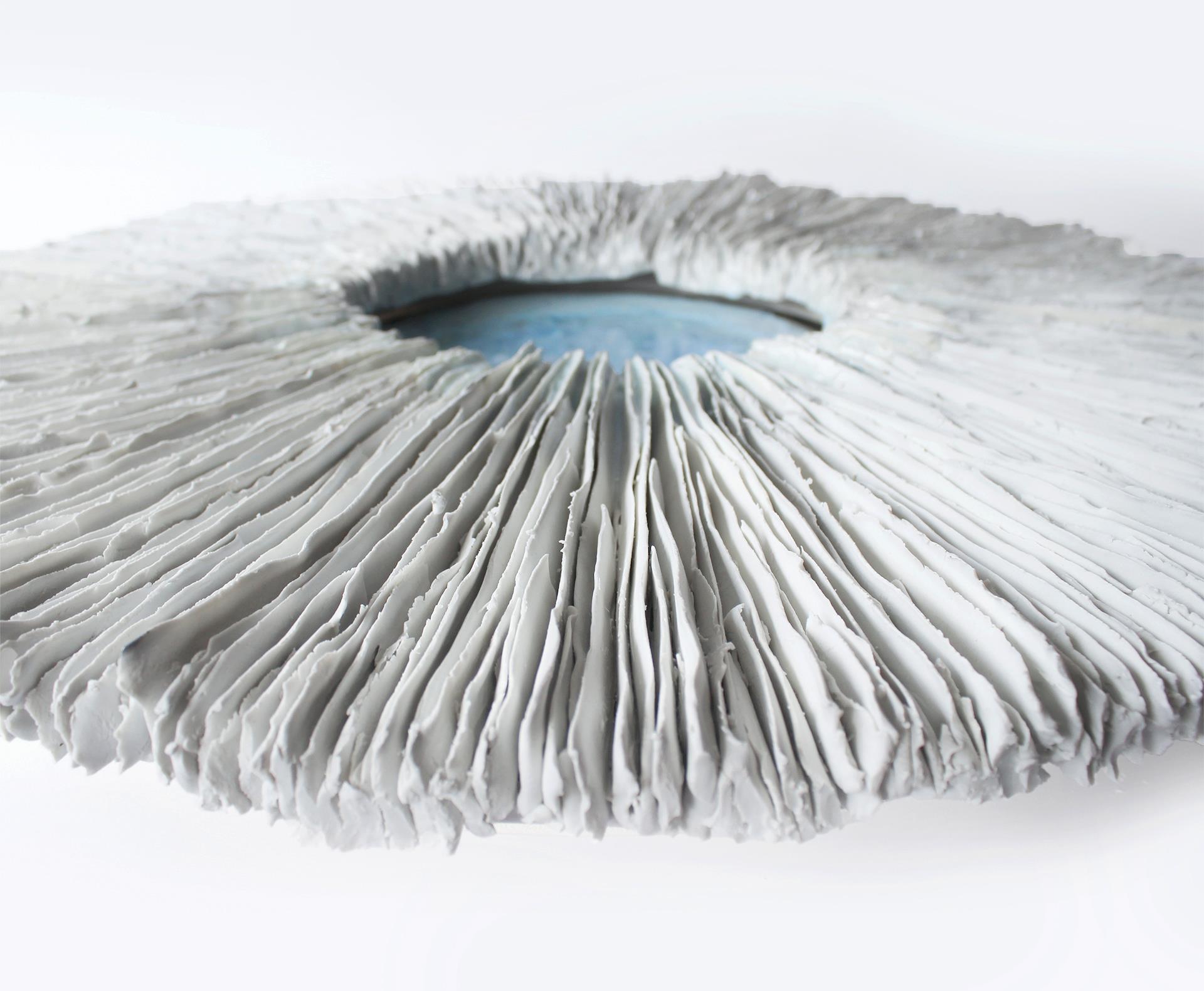 《天环》,壁挂陶瓷雕塑,静谧壮美,唤起人们对天体现象与有机节律的联想。作品从深邃的蓝色釉面中心向外辐射,细致排列的瓷质褶层如同日食的光环,亦像自高处俯瞰水面的涟漪。圆形构图既沉静又庄严,邀请观者沉思于自然的循环、引力的牵引,以及内在宁静与外部运动之间的微妙界限。作品由瓷土与炻器土塑成,结构坚实却不失精致。中央釉面呈现出如潮水般汇聚的蓝色,流动而富有深度。外缘未上釉的褶皱形成触觉上的强烈对比,让人联想到地质结构、海洋生物或行星环带。 作品固定于木制底座,结合木材与胶水,强调了手工与材料之间的联系。《天环》唤起多重联想——救生圈、光环、眼睛或空洞。它可能是一种保护的象征,一个边界,或是一种绕记忆和空间旋转的静默轨道。其对称性与质感让观者放慢脚步,凝视那些“介于”之中的空隙:陆与海之间、身体与宇宙之间、表层与深处之间。
