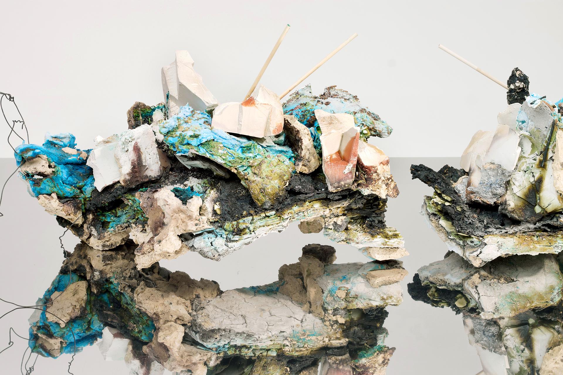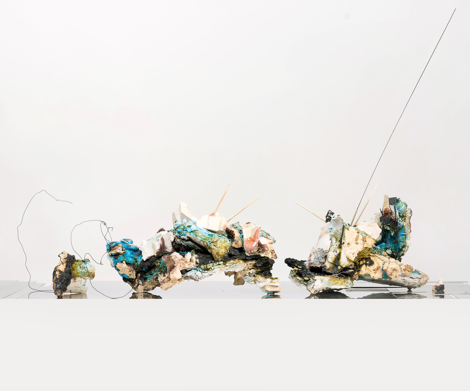 “Massafra”通过原始而不规则的形态唤起人们对岩石、矿物和工业遗迹的联想,这些形态似乎承载着时间的印迹。其表面让人联想到地质构造、化石和考古遗物;裂缝与断层象征着地壳的运动,反映出塑造我们星球的张力与冲突。这些抽象的形态描绘出未来的图景——自然与人类需要建立新的平衡。通过陶瓷与铁质材料、氧化物和釉料的组合堆叠,经过时间沉淀,产生出前所未有的结构。创作如同考古层序,材料在时间中重叠与沉淀,创造出一种物质的沉积记忆。一种新的“自然”形态开始占据主导地位:形状与空间赋予作品生命,布满了结痂状结构和物质上的变化。这些形态变得锋利,仿佛峭壁的锯齿边缘,岩石般的表面仿佛古老的石化“方舟”——一个未来的诺亚方舟。 这一形象暗喻着人类希望调和自然与文明的力量,提醒人类与自然脱节所带来的危险。在宇宙的浩瀚面前,这件作品引导我们思考人类的渺小,以及尊重地球资源的必要性,唤醒我们重新关注地球与人类的关系。其中出现的碎片让人想起当代城市的遗迹:破碎的形态如同“城市遗物”从地面升起,如同世末考古学,描述着荒漠般的场景。这件作品引发我们重新审视自我,打开新的世界。