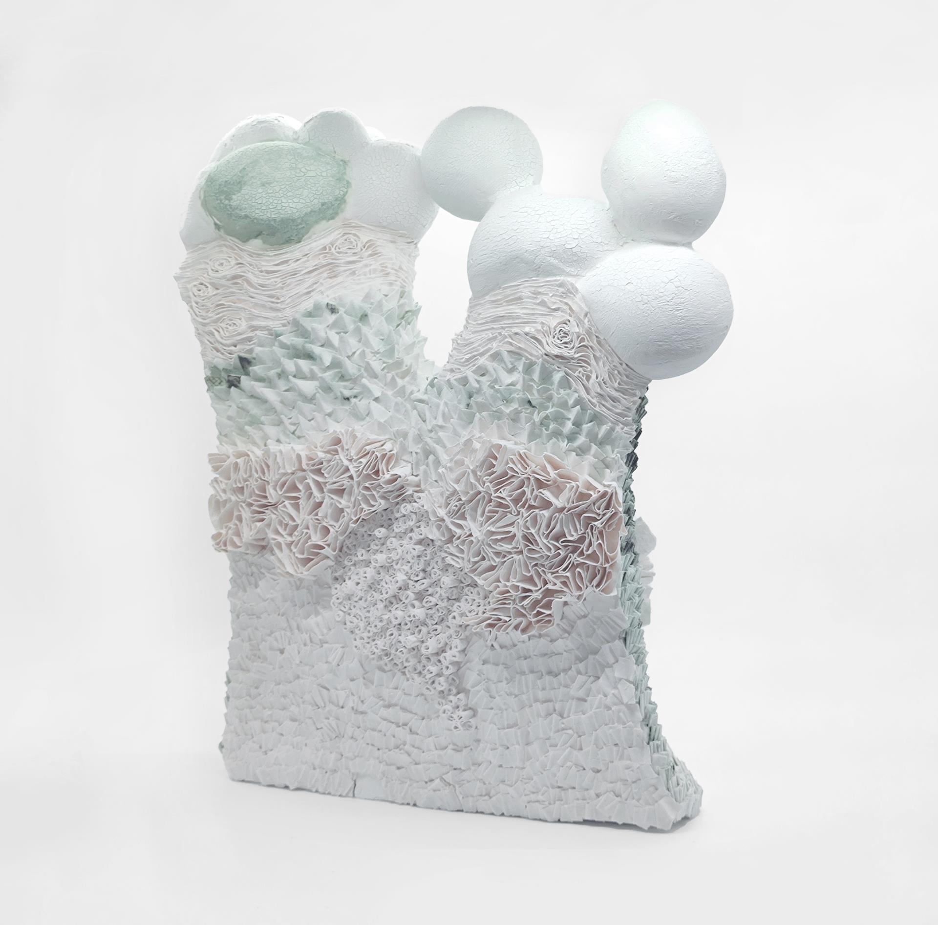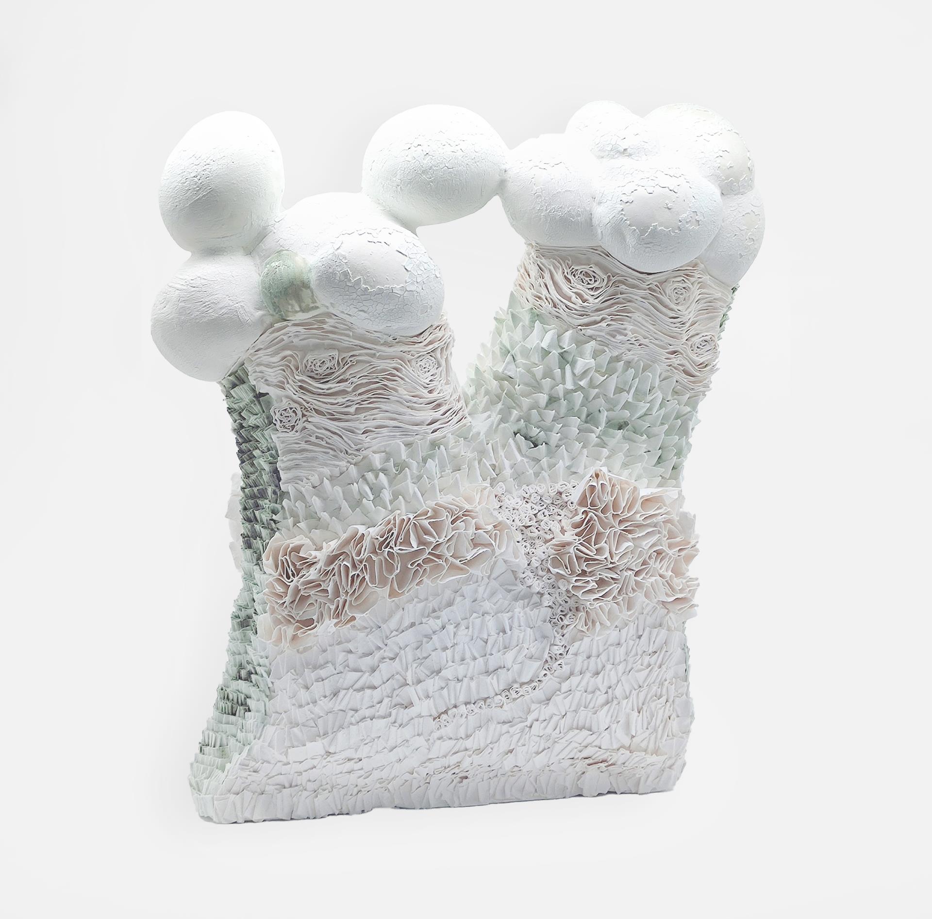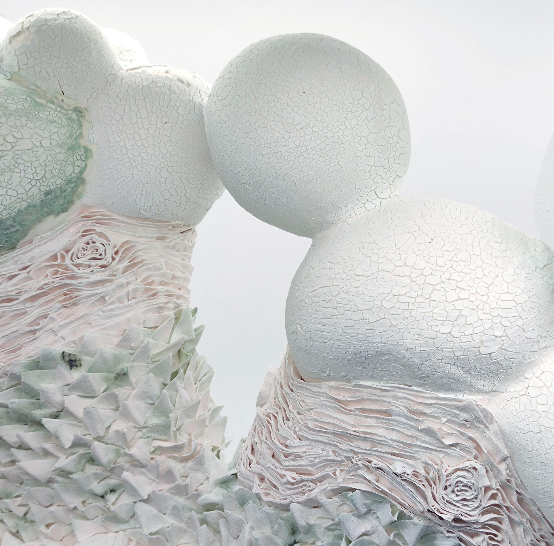 《寂静之前》是一件独特的雕塑作品,灵感来自气候变化压力下海洋生态系统的急速转变。作品展现了珊瑚形态的复杂之美,既是对珊瑚群落复杂之美的致敬,也是对濒临消失的脆弱生物的警示。 这件作品由瓷质粘土制成,将细致的表面纹理与有机的垂直形态相结合。层层错综复杂的折叠、褶皱和盘绕的粘土,模仿着珊瑚礁的活生生的结构。这些精致的结构被刻意渲染成苍白到近乎漂白的色调,象征着海洋温度上升导致珊瑚白化现象。圆润上部形态上的裂纹釉面营造出一种断裂和腐烂的感觉,暗示着珊瑚礁完整性的逐渐侵蚀。它象征着一个正在崩塌的世界,不是突然崩塌,而是通过一个几乎难以察觉的崩塌过程。 然而,在去饱和的色彩中,却残留着一丝淡淡的绿色。这柔和、半透明的色调静静地浮现在纹理丰富的表面,象征着希望与新生。它表明,即使面对环境创伤,只要我们及时采取行动,大自然或许仍能保持其韧性。《寂静之前》探索了失落与忍耐、沉默与记忆、脆弱与力量之间的张力。它引领观者进入一个反思的空间:思考即使消逝却依然永恒的美,思考将我们与濒临灭绝的生态系统紧密联系在一起的微妙线索。