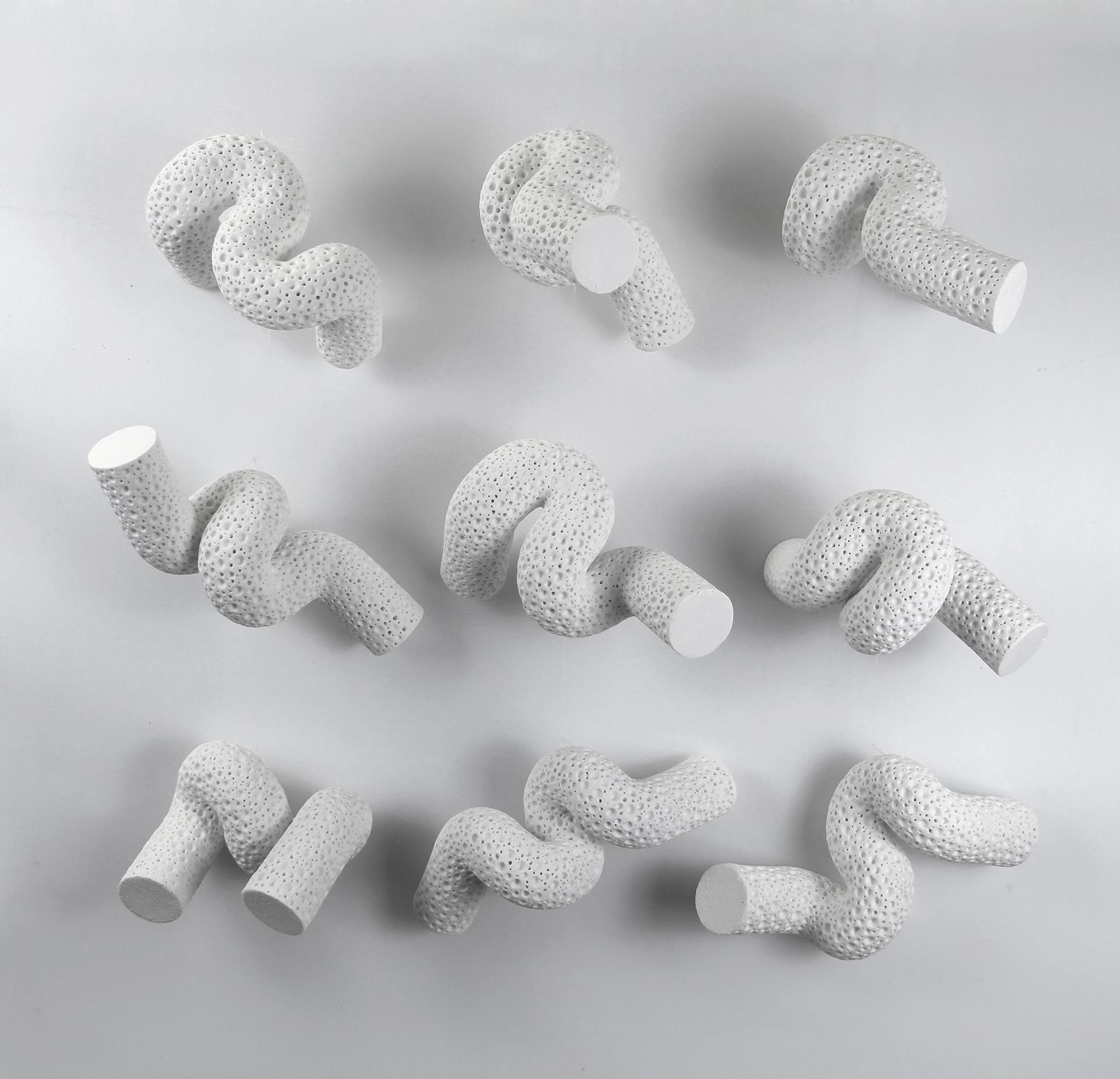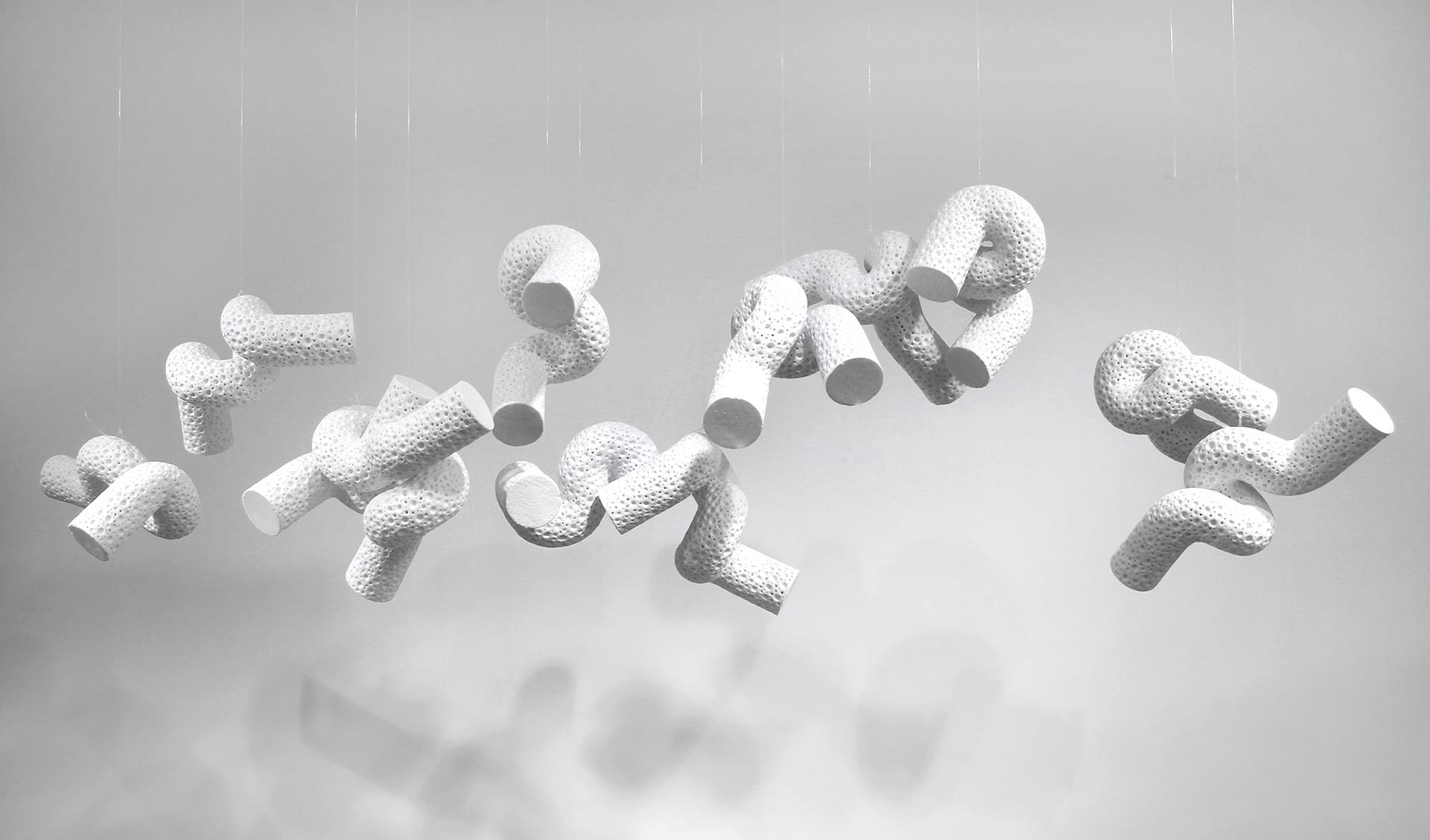 这是一组漂浮于空中的瓷之节奏。由德化白瓷制成的弯曲管状体,像是被时间揉皱的气流,亦或是未被命名的生物,游弋于无声的空间之中。肌理如海洋微生物般繁复密布,诉说着内在的秩序与混沌的边界。 在静默中,它们彼此回应、轻盈旋舞,像是一场无言的思想流动,也似是对生命形态的冥想——无始无终,无名无状。它们既似断裂的连接,也似从未分离的整体,悬于可感与不可感之间,轻轻拂动我们对存在的感知。