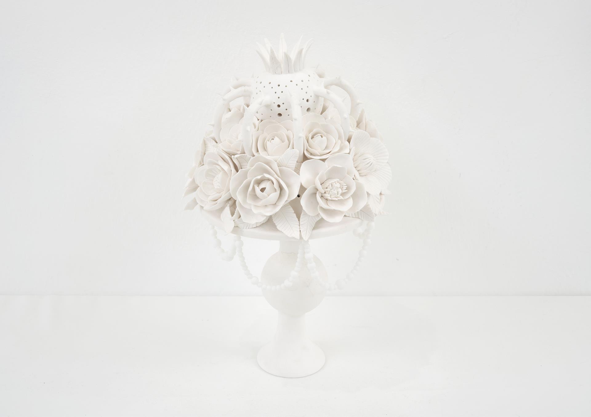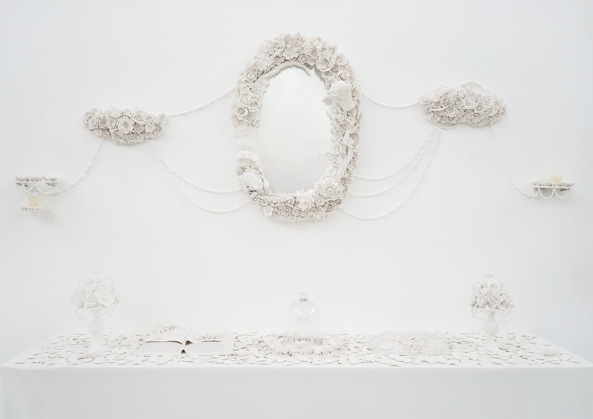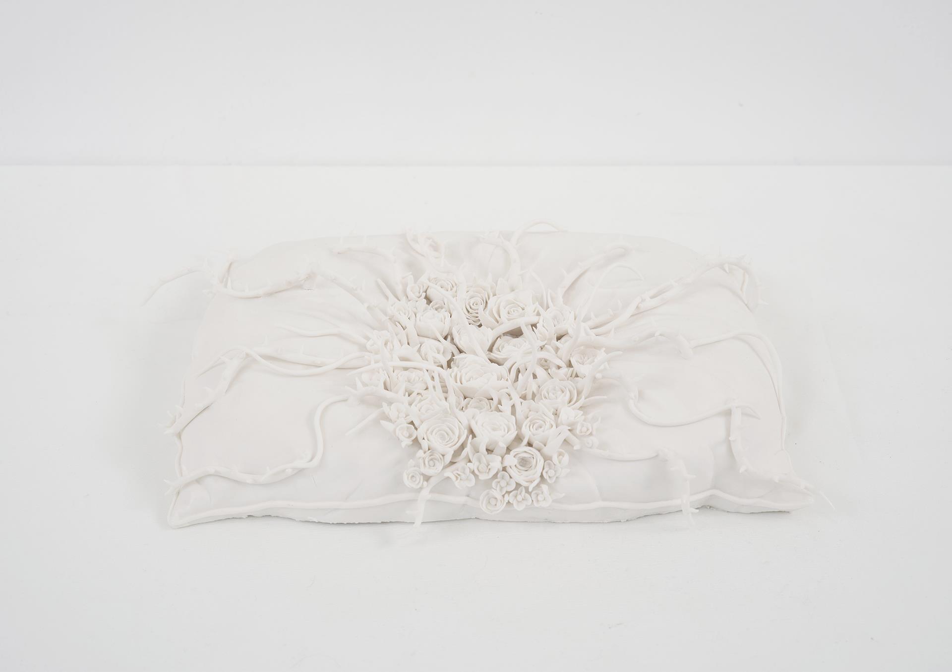 《繁花春序》系列作品,以德化白瓷为载体,是对日常生活诗意凝视的艺术结晶。选取了镜子、枕头、书本、烛台等保留着生活温度与时光痕迹的寻常物件作为创作母题,运用德化传承千年的捏花技法,赋予这些沉默的熟悉物品以全新的生命形态与艺术灵魂。 这些陶瓷作品里的“春之元素”并非简单附着,而是从器物本体中自然“生长”而出:花朵在枕畔悄然绽放,枝叶在书脊间攀缘舒展,藤蔓缠绕烛台向上。德化白瓷特有的莹润光泽与细腻质感,完美捕捉并凝固了自然界花朵最娇嫩的肌理与最鲜活的瞬间,仿佛将整个盎然的春天浓缩、封存于这永恒的洁白之中。不仅仅是对自然形态的摹写,更是对传统工艺深度与当代艺术表达的探索。每一片花瓣的弧度、每一条叶脉的走向都凝聚着时间的重量与技艺的传承。日常的宁静(如枕、书)与生命的蓬勃(繁花)在此和谐共生,形成强烈的视觉与意境对比。 作品以最纯粹的白,映照出生活中最丰富的诗意,提醒我们:美,往往就蕴藏在那触手可及的寻常之物中,只需一颗善于发现与感受的心,便能从最朴素的日常里,聆听到整个春天序曲的奏鸣。