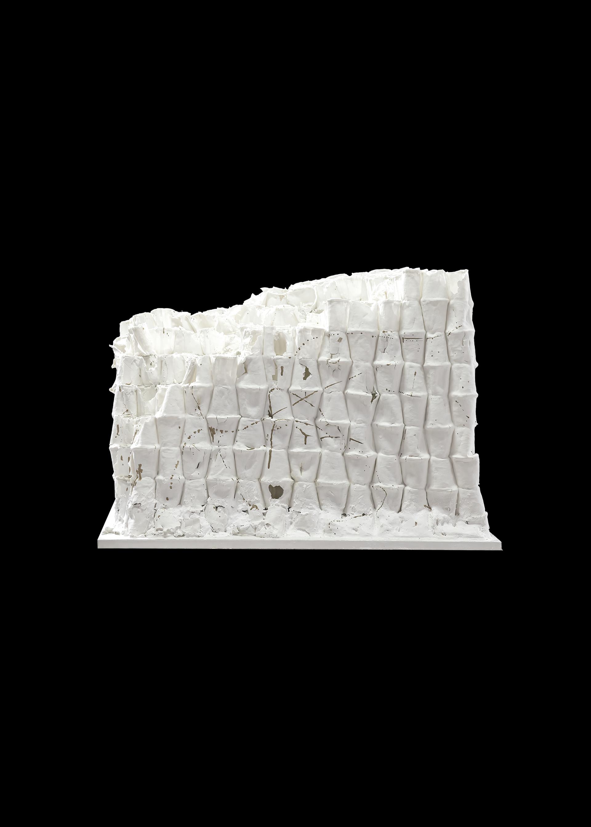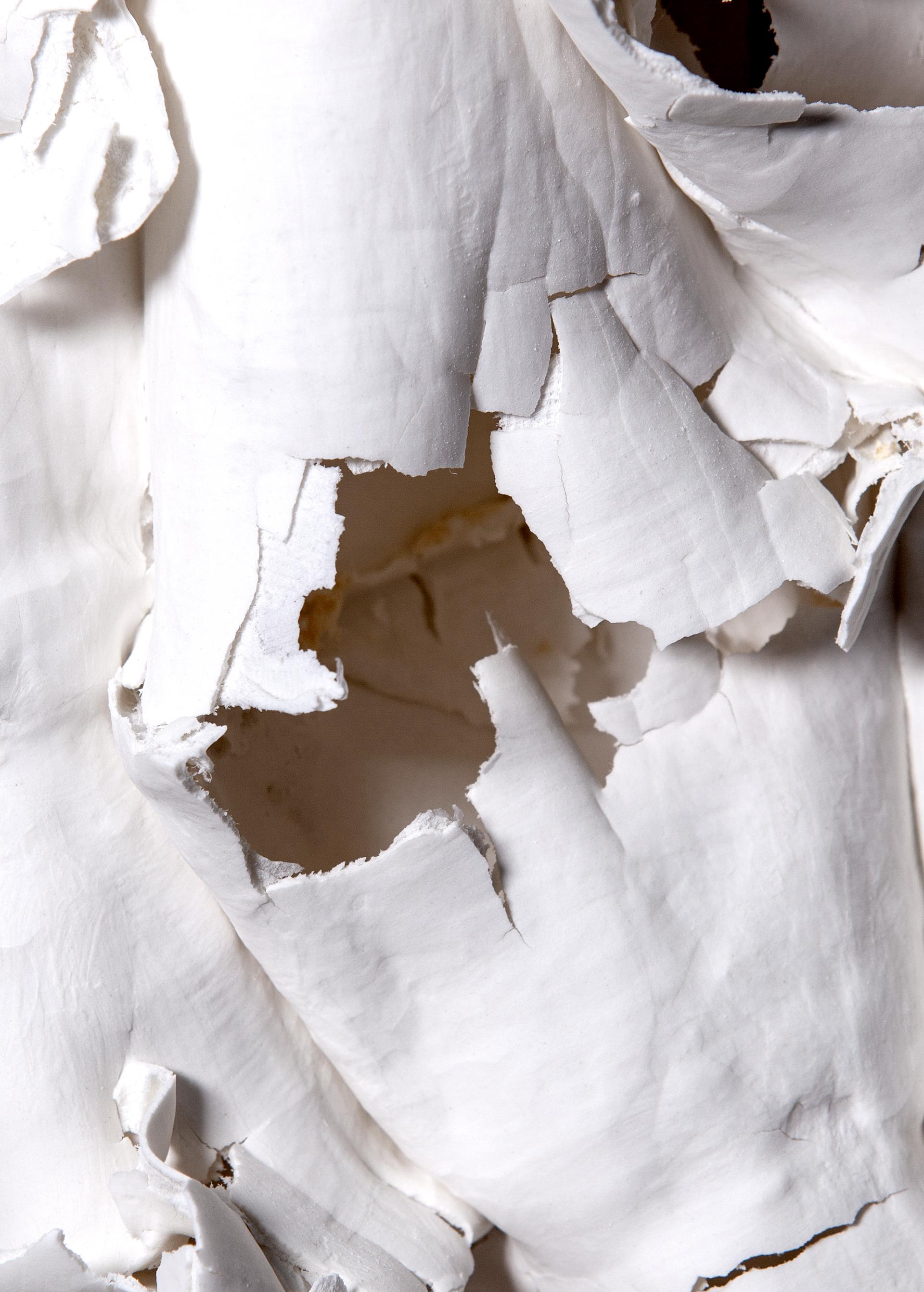 本作品由一次性纸杯辅以部分软质材料堆叠组合成型在造型外部刷涂不同厚度的高白泥浆经1280度高温气窑烧成。烧成后出现了开裂,塌陷,崩碎等不同的烧成状态,呈现了多种不同的陶瓷材质肌理效果。这种高温熔融下的多种媒介与陶瓷材料结合并融合转化而产生的自然纯粹,充分体现了陶瓷材质肌理之美的审美情趣。作品烧成后底部使用了少量石膏休整,定型,使造型整体更加稳固,挺拔。