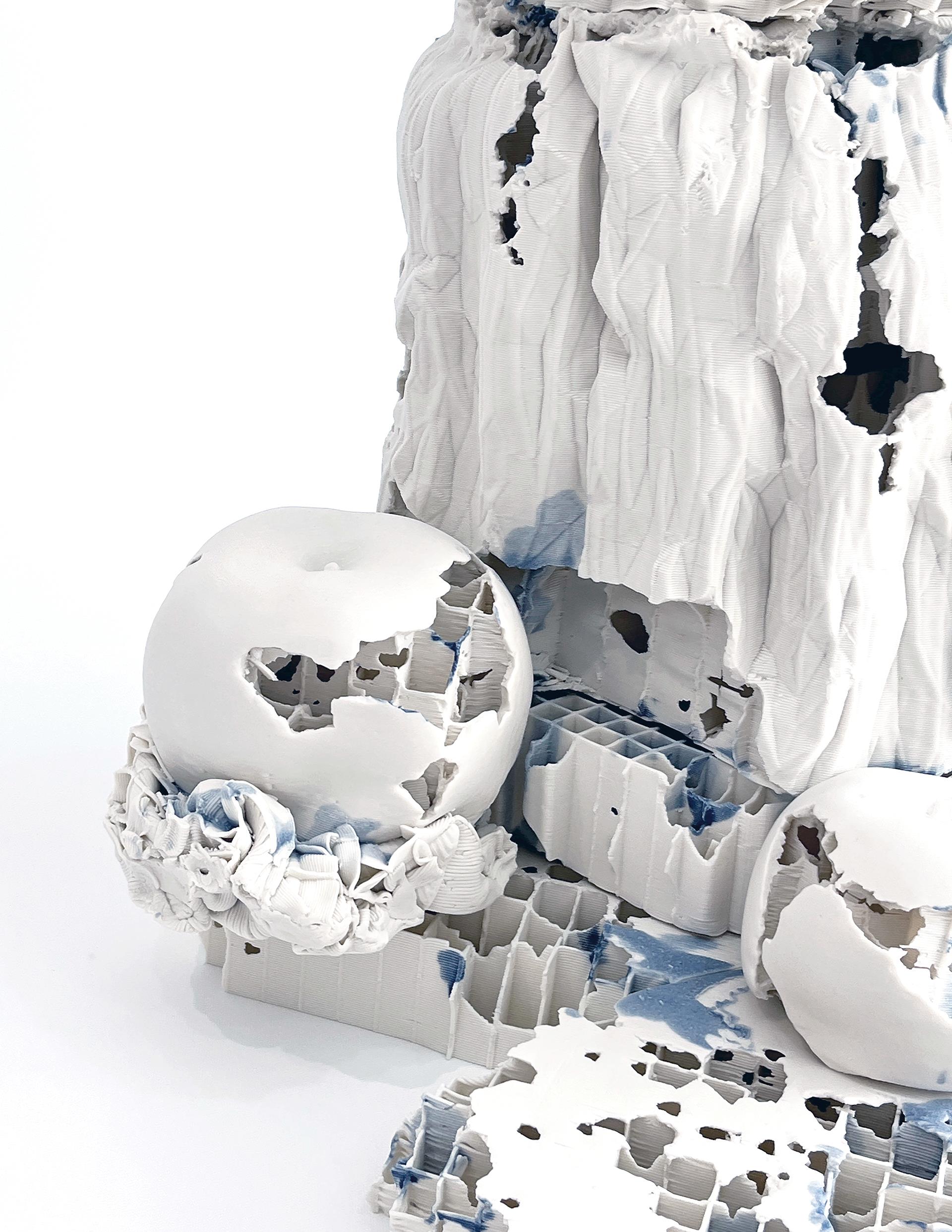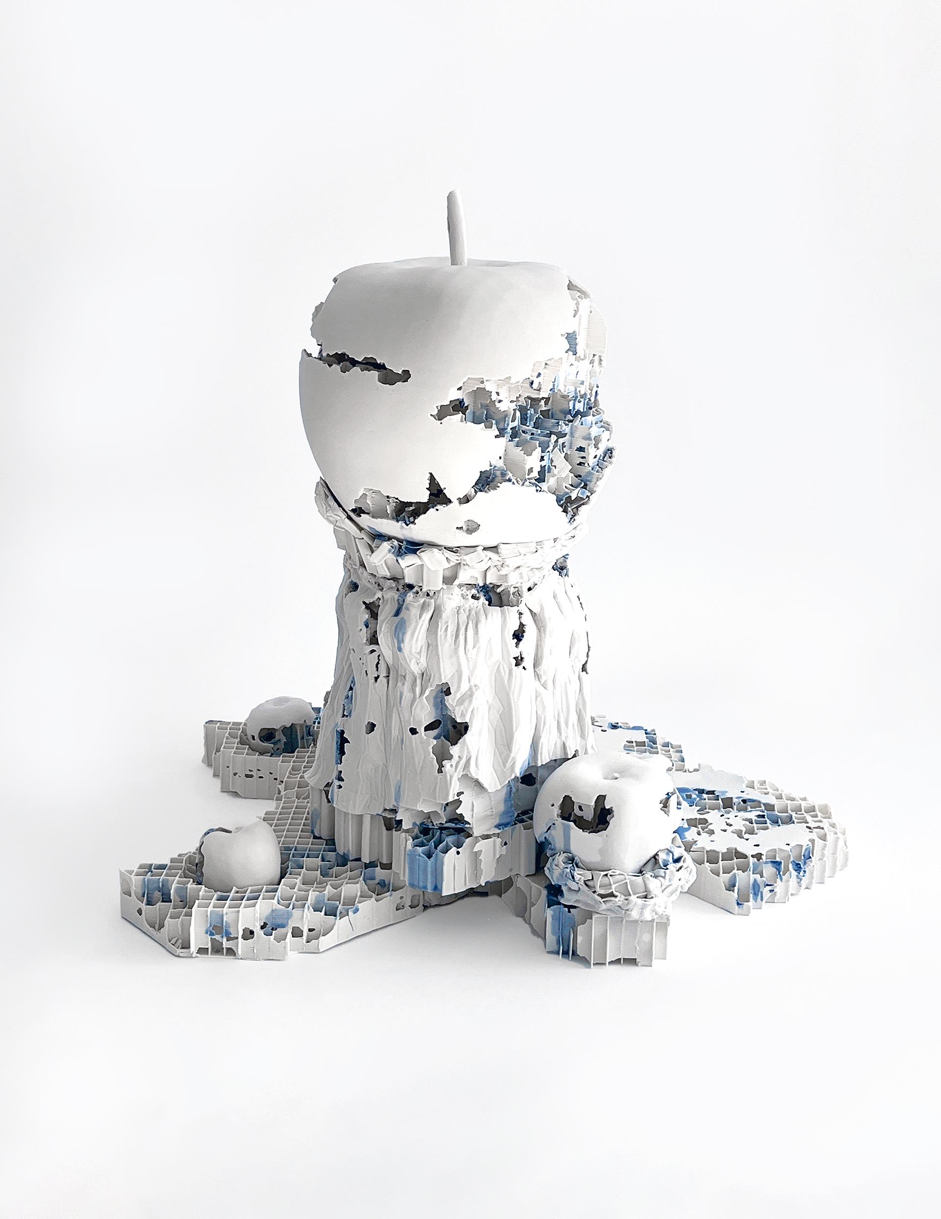 最后的花园 将禁果的隐喻与当今的生态危机交织在一起,反映了人类重复犯下的错误。曾经象征人类与自然分离的禁果,如今与气候变化、过度消费和环境崩溃等破坏性力量产生共鸣。破碎的苹果形态既体现了这一循环的起点,也展现了其后果,邀请观者直面自然世界的脆弱。这里的“花园”意象不仅代表自然的一部分,也象征着人类的集体记忆与共同未来。像一枚脆弱的时间胶囊,这件雕塑唤起了人们对地球消逝景观的感知。它破裂的表面和内向的形态,承载着自然侵蚀与人类贪婪的痕迹。瓷器的纤薄与半透明质感强调了生命的脆弱。雕塑通过将3D打印的数字形式与手工细节结合的创作,反映了技术进步与人类支配自然欲望之间的紧张关系。淡蓝色的内腔暗示着生命的最后痕迹,回荡着一座消逝花园的寂静。《最后的花园》不仅仅是一件具有审美价值的作品,更是一种警示。正如禁果既象征知识也象征失去,这件作品质问人类能否守护自己的“最后花园”,抑或正站在不可逆转的失落边缘。