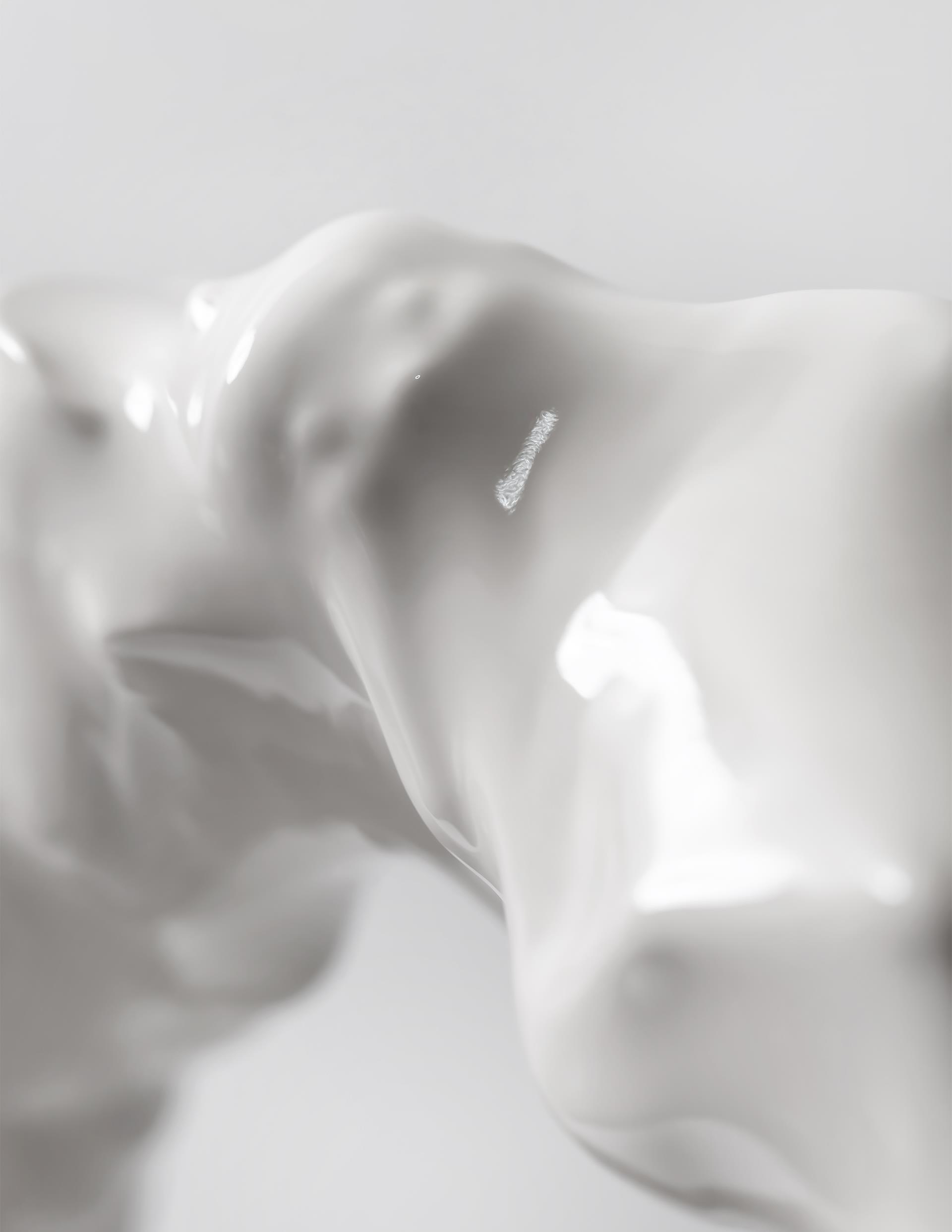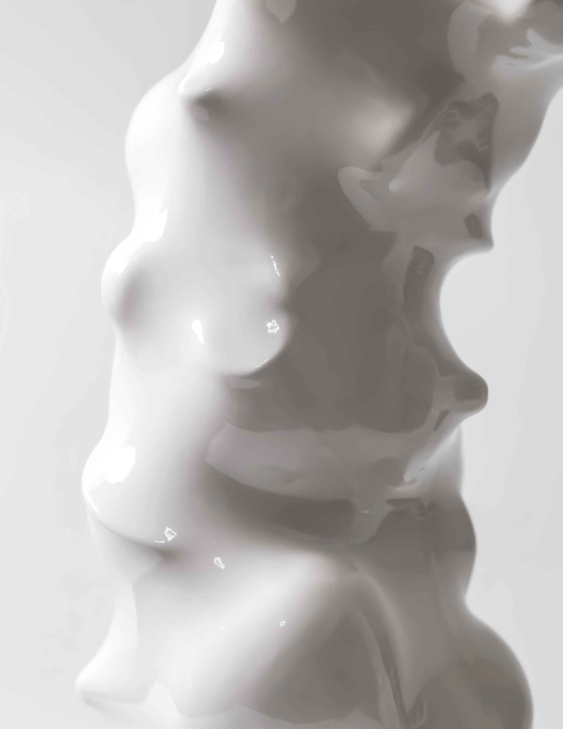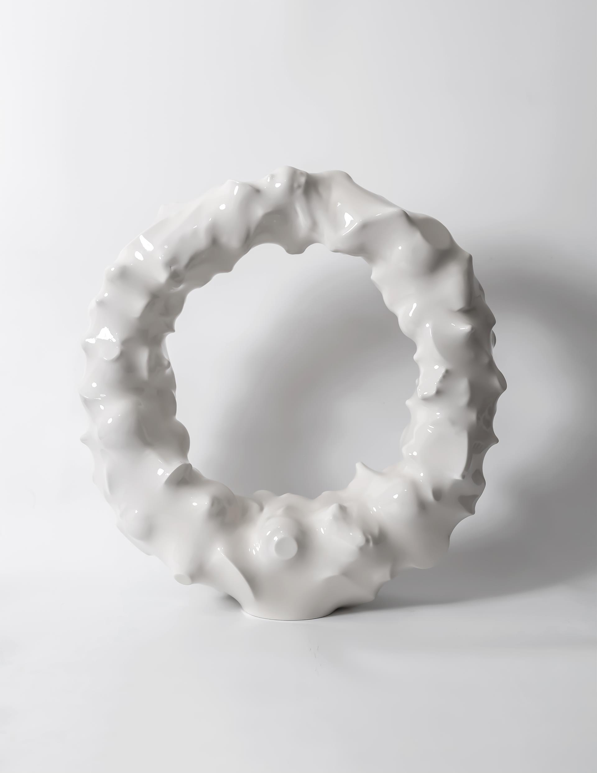 作品整体呈一个圆环状,通体白色,色泽温润。底面有平底可以平稳的放置在展台上。在原材料上使用了河北省曲阳县当地传统的定窑瓷土,外观施定窑经典的象牙白釉色,经1300度高温氧化烧成。