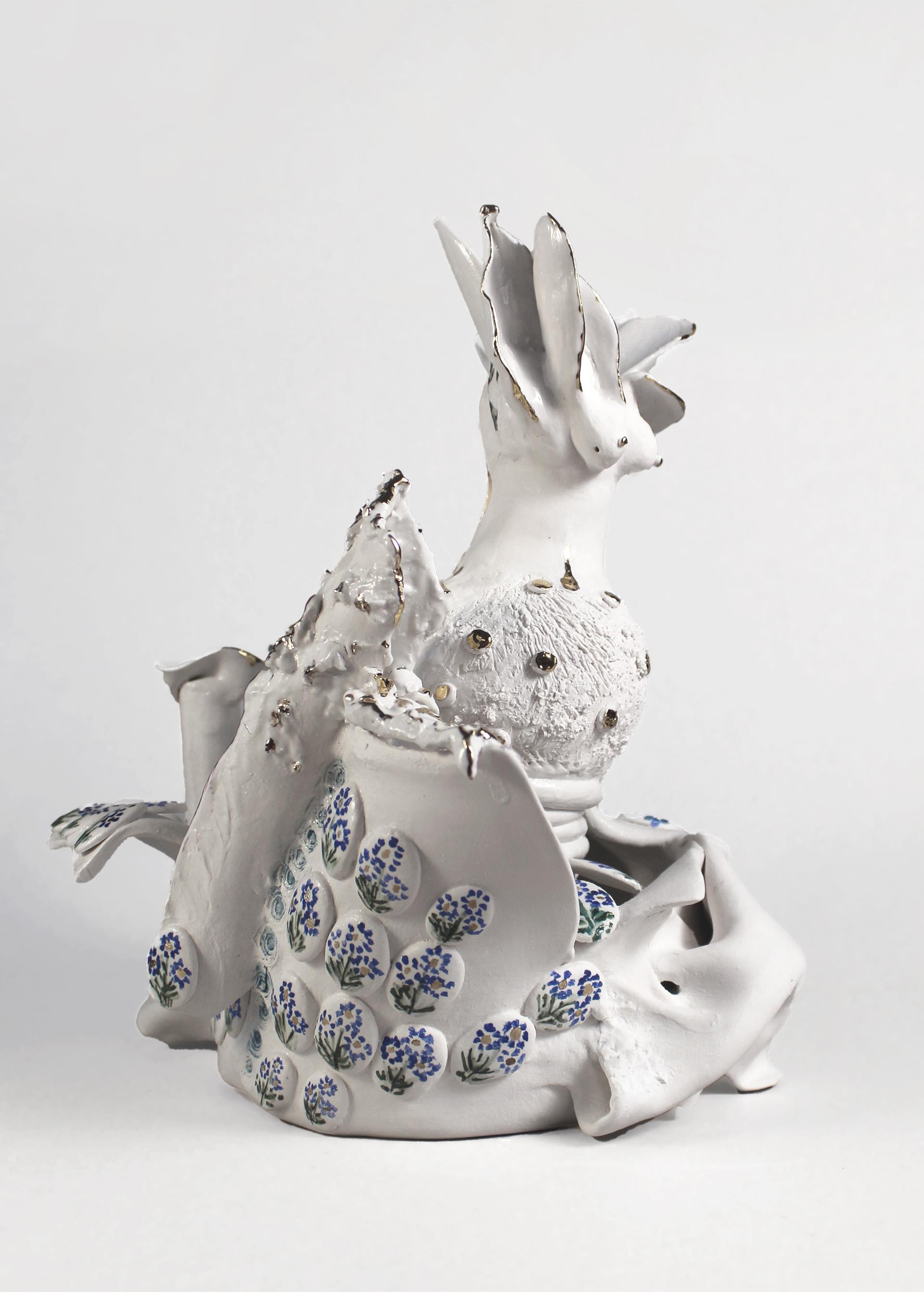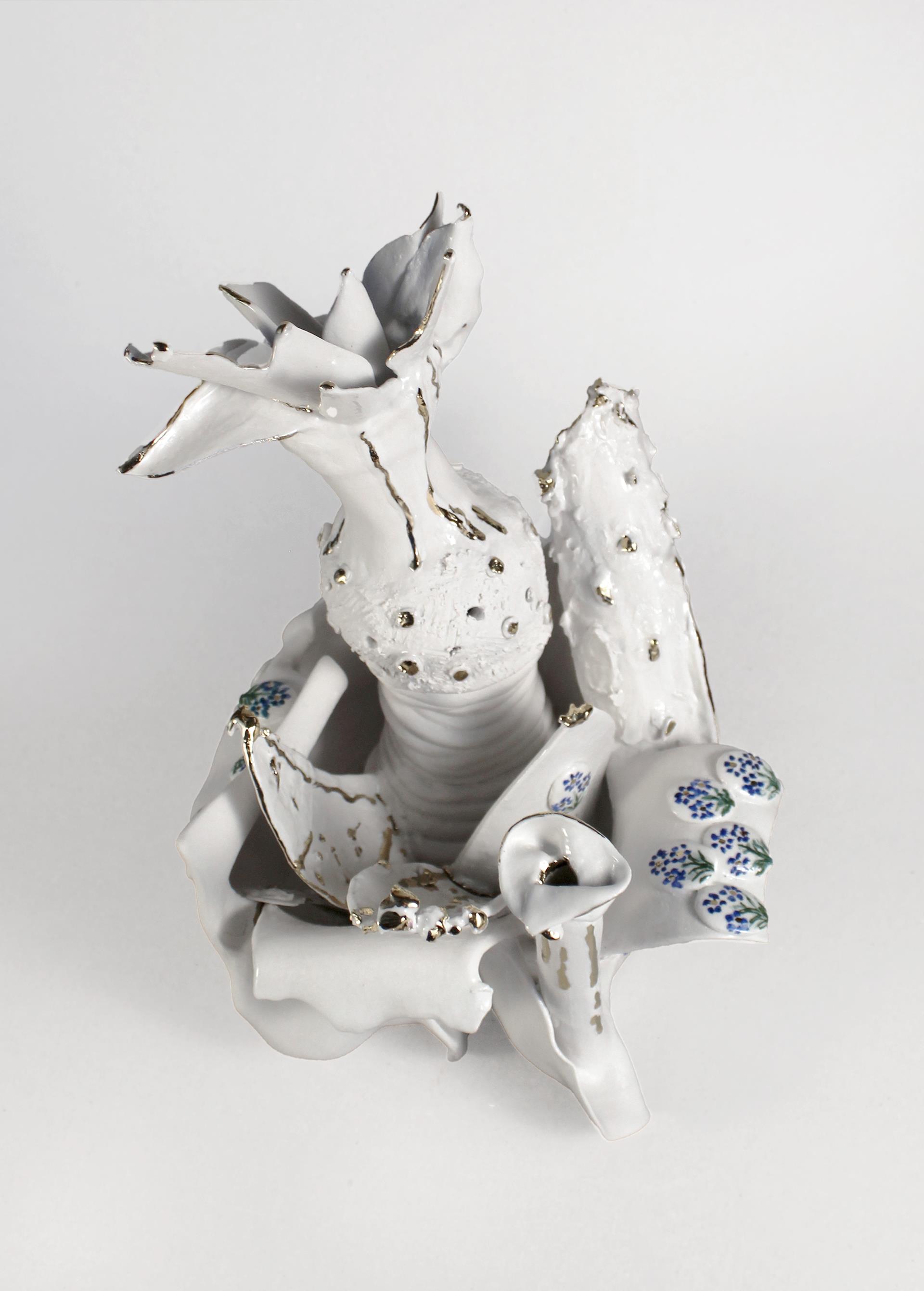 这件瓷雕作品呈现出一朵奇幻而富有想象力的花朵,优雅地从充满动感的有机基座中绽放而出。作品完全采用白瓷制作,既精致又富有表现力,将抽象的花卉形态与暗示性的人体元素巧妙融合。构图核心处,一具小型抽象女性躯干隐于绽放的结构之中。这具无臂无首的躯干象征着女性特质、感性魅力,以及人体与自然间的亲密联结。雕塑形态如花瓣般舒展展开,呈现出丰富多变的质感与形态交织。金箔点缀于花瓣边缘及表面细节,赋予作品精致珍贵的质感。雕塑下部饰以手绘的蓝色调小花纹样,既呼应传统瓷器装饰技法,又形成当代造型与古典装饰的对比。光滑流畅的瓷质与粗粝有纹的区域并置,赋予作品强烈的表现张力。花朵仿佛正处于绽放或蜕变的瞬间,引导观者探索生长、蜕变与不完美之美等主题。这件作品邀请观者进行解读:它既可被视为对女性躯体的诗意礼赞,亦可诠释为对自然韧性的礼赞,或是自然与想象交汇处那脆弱而强大的能量的礼赞。通过其精妙的细节与象征性的形态,雕塑构建出既温柔又神秘、既富有感染力又引人遐想的视觉叙事。