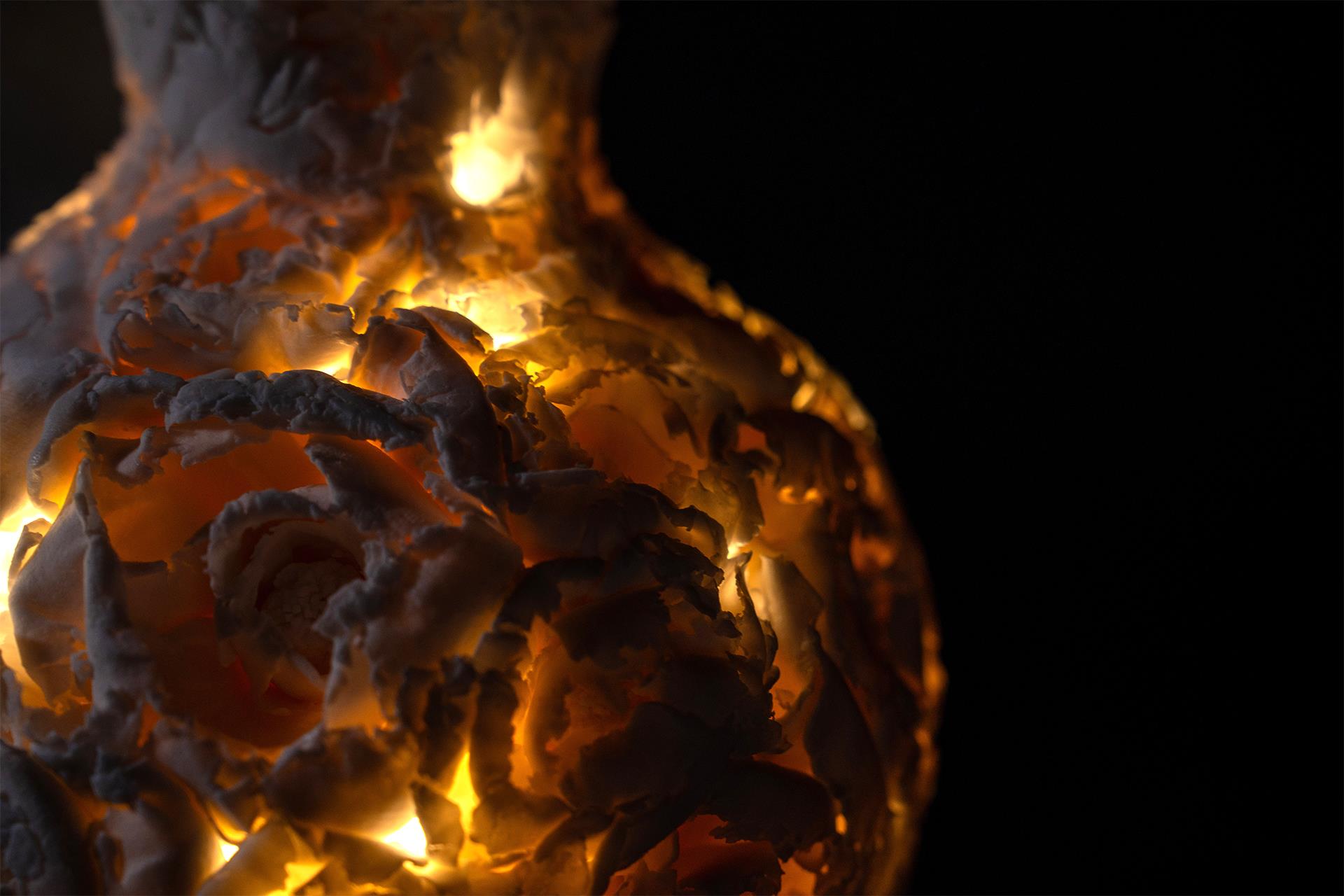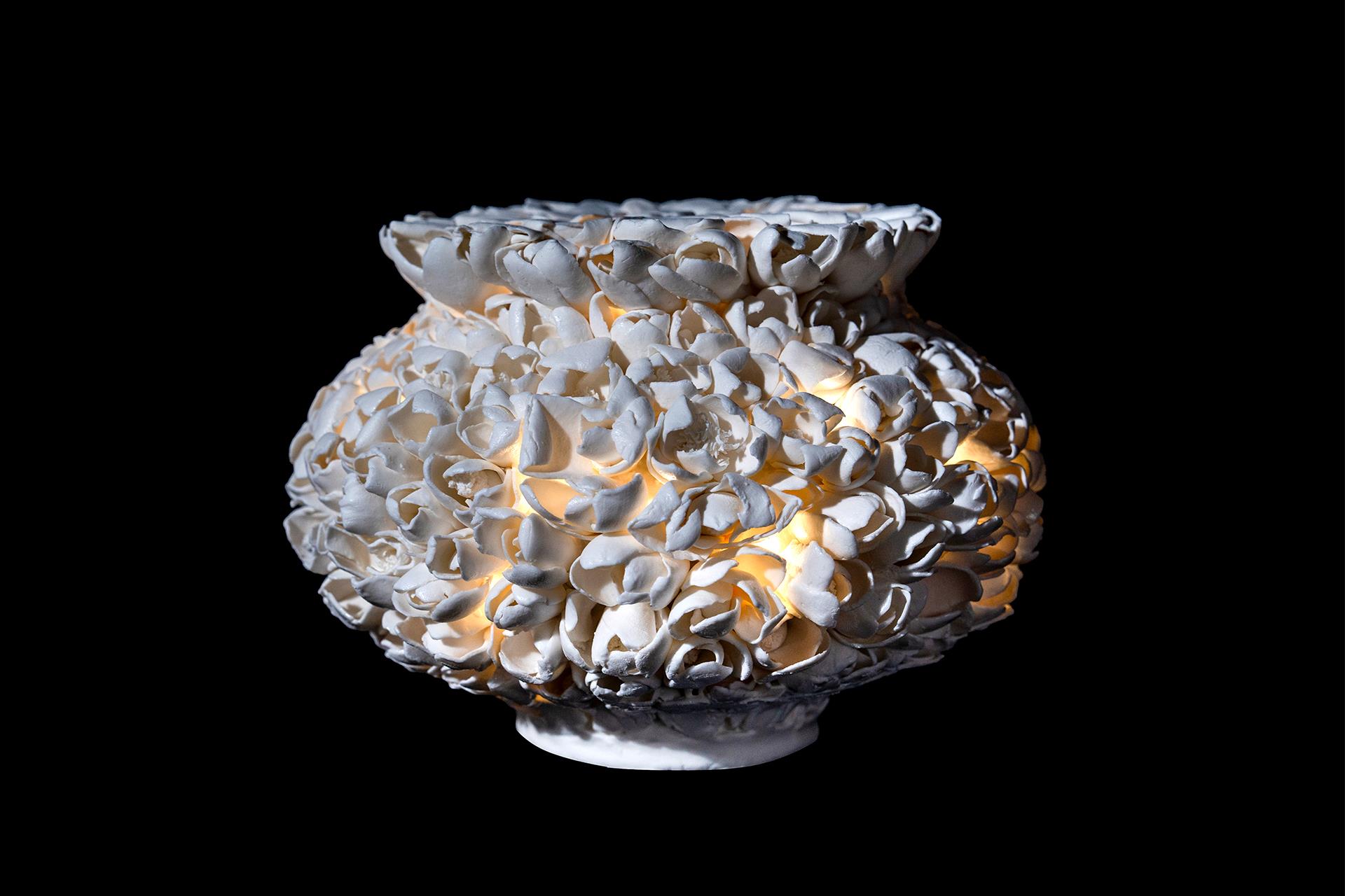 以德化玉泥为载体,借捏花技艺诠释 “柔质承重” 的当代女性精神。德化白瓷素以 “中国白” 著称,玉泥温润凝脂的质感,恰如女性细腻坚韧的生命底色。创作中手工捏制数千朵陶瓷花,每瓣肌理皆循自然花形,却在组合成瓶体的过程中,通过梯度挤压工艺使其产生结构性变形 。花瓣边缘的皲裂、弧度的扭曲,恰似时代女性在多重角色中承受的无形压力。 瓶体造型突破传统器皿范式,以花朵集群为基本单元,通过陶瓷成型工艺的张力控制,让 “个体绽放” 与 “整体塑形” 形成矛盾统一,单朵花的残破与瓶体的完整互为镜像,既展现捏花工艺对细节的极致雕琢,亦以 “千花成器” 的隐喻,致敬女性在压力下将伤痕转化为力量的生命美学。此作将德化白瓷的工艺传统与当代社会议题相勾连,让 “中国白” 不仅是材质的象征,更成为女性精神的视觉载体。