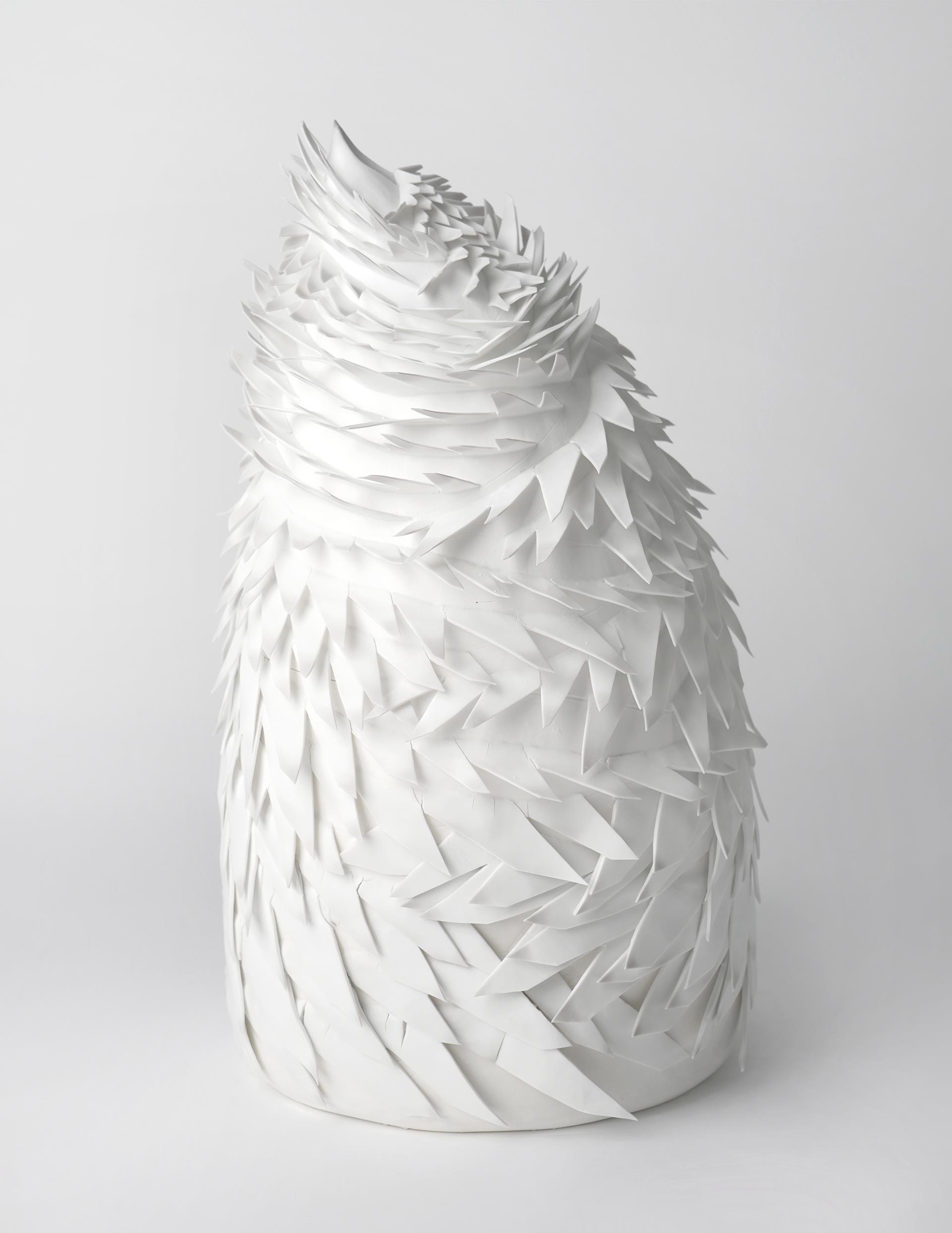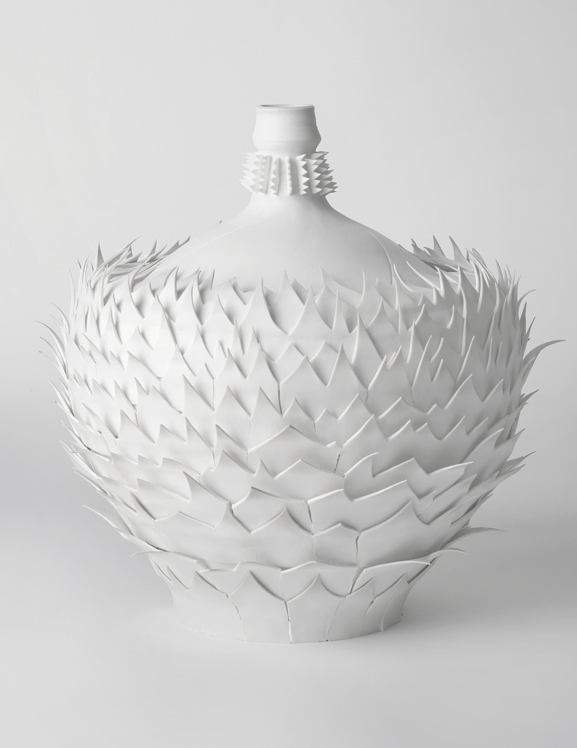 作品诠释了一段关于生长哲学的故事,这些象征生命力量的意象裹挟在锐利的锯齿之下,似乎在诉说这些生命将被锯齿终结的命运,又仿佛是其本身在向外部世界的威胁与不确定性回应,同时预示了一种可能的未来景象。锯齿形状的棱角分明与自然植物的柔美线条形成了鲜明对比,象征着生命中的矛盾与和谐。锯齿的形态仿佛诉说着生命中不可避免的挫折与挑战,而植物种子、春笋、花苞则象征着美好与希望,展现出一种强烈的生命力和韧性。作品通过这种对比和融合,建构了自然界与人类社会间的隐秘对话,这不仅仅是对生态脆弱性的深思,更是对宇宙生命意志的哲思邀请,以及对存在本质的无限追问和对未来生态伦理的慎思。