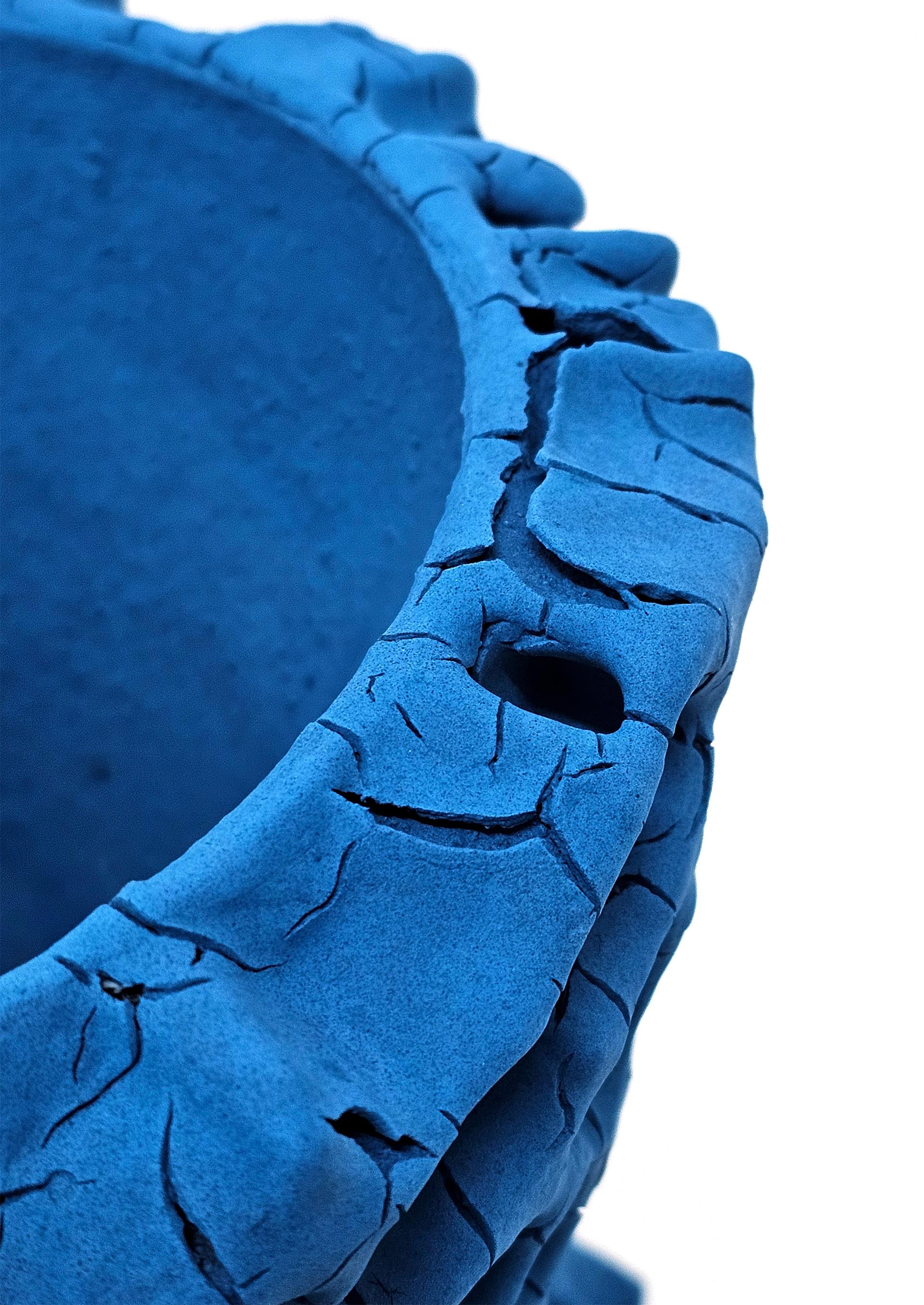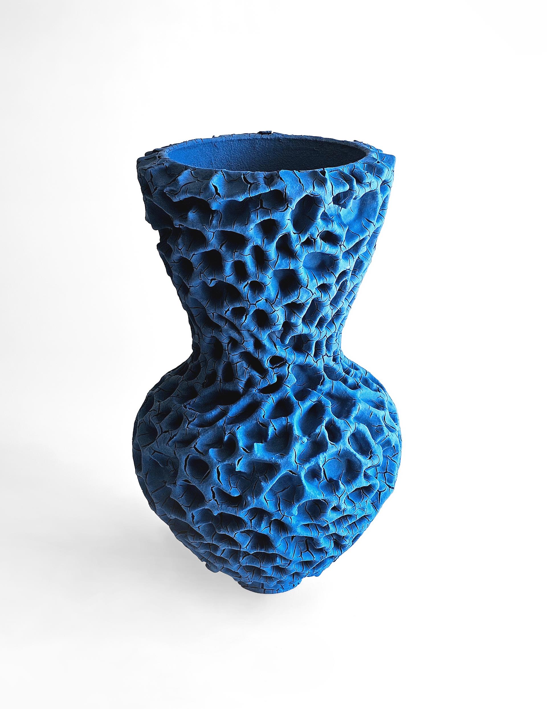 在这件作品中,我想将我长期实验的珊瑚状表面工艺与当代形态相融合,成为一件具有鲜明特点的器皿。我希望这件作品兼具设计感与破败感,同时又有自然、原始的特质——它们在诉说美与遗忘时,以同样的力度低语着永恒。器皿在陶轮上拉坯成型,采用石器与瓷土混合材质进行雕塑塑形。珊瑚纹样经拼接与精修后施加于器身,经1240摄氏度高温烧制后,反复浸入浓稠瓷釉中,再经1240摄氏度二次烧制。最终色泽源于釉下彩喷涂工艺,需经多次烧制方能定色