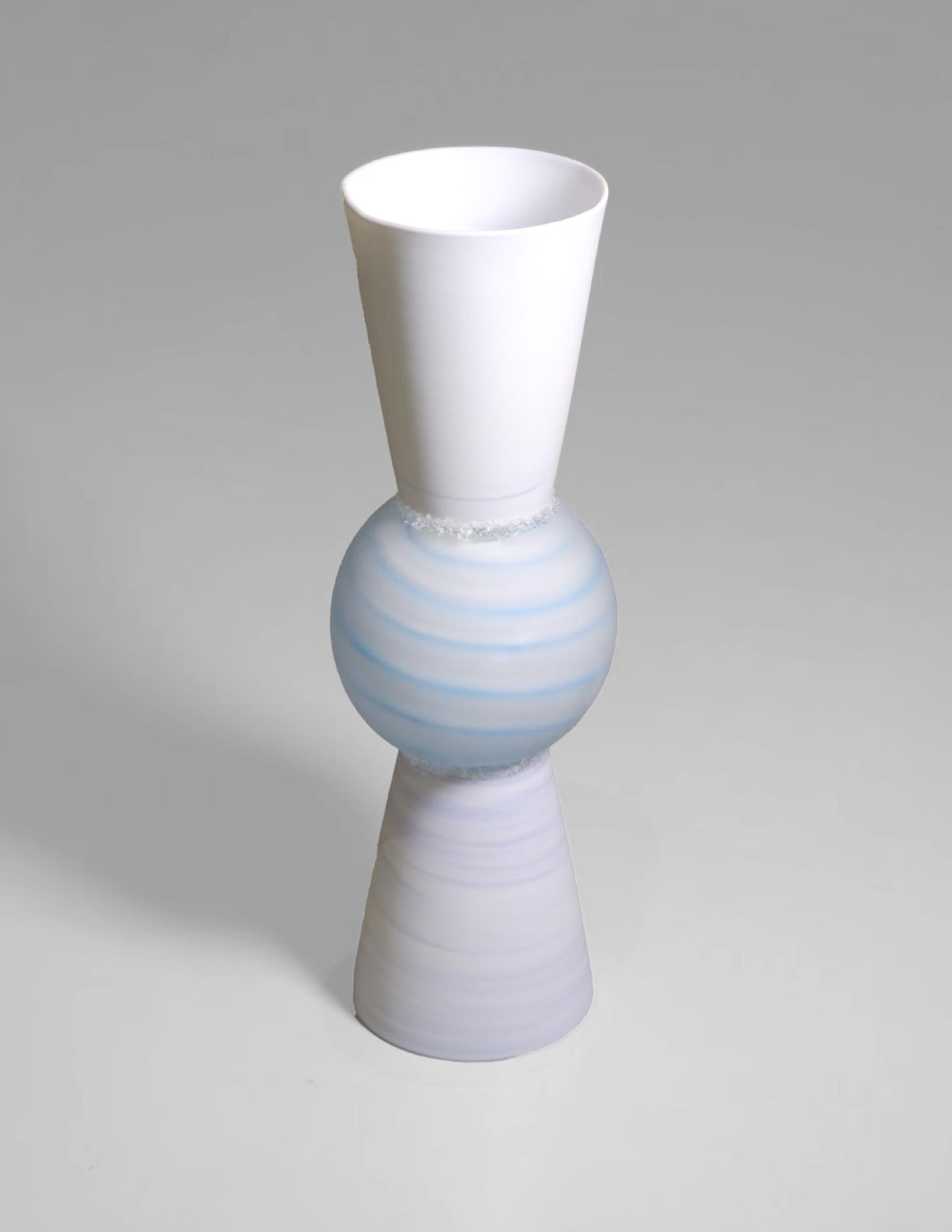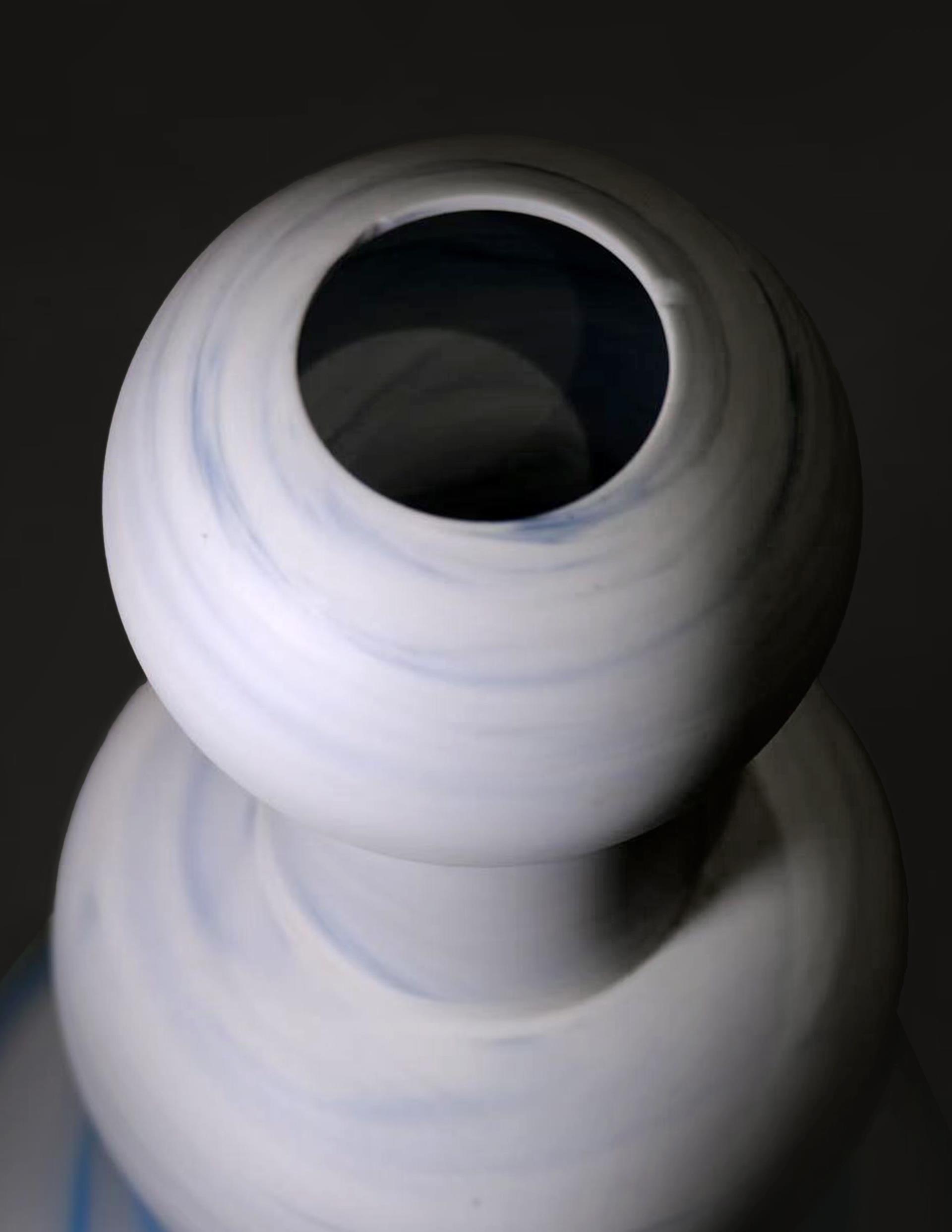 《界·融》是一件探索材质边界与融合可能的跨媒介作品。作品主体由数十件形态各异、高矮不一的陶瓷与玻璃瓶状器皿构成,它们被精心排列,形成一片疏密相间、错落有致的立体阵列,宛如一片静谧而富有生机的“器物森林”。 器皿表面流动着蓝色旋转花纹。这些纹路不仅是视觉的律动,更象征着材质在极限状态下的对话与交互。作品的核心在于打破“界”限:我将玻璃的通透流动与陶瓷的温厚稳定置于共同的创作语境中,促使两种特性迥异的材质相互渗透、交融共生。最终呈现的作品里,观者难以清晰区分材质的绝对界限,玻璃与陶瓷的物理特性被创造性地“融”合,形成了一种兼具双方优点、刚柔并济的全新物质表达。材质的界限被打破后,并非走向混沌,而是催生出一种新的秩序与联结。玻璃与陶瓷如同共生的生命体,它们的特性在这片森林中循环、共鸣,形成有机的整体。 《界·融》因此超越了物件的集合。它是一场关于突破与重生的视觉宣言:蓝色旋转花纹凝固了交融的动态瞬间,森林般的阵列昭示着新秩序的蓬勃力量。作品邀请观者凝视这“界”被消弭、“融”被达成的永恒瞬间,感受破界之后所孕育的无限可能与和谐共生之美。
