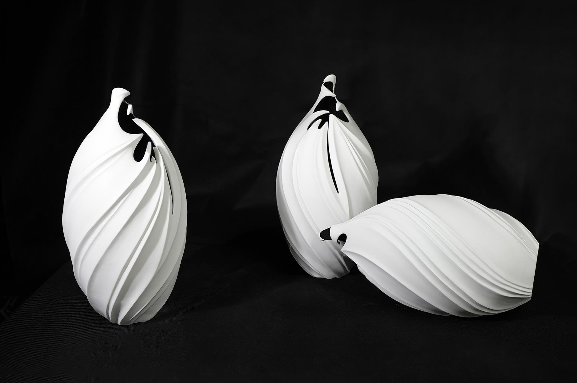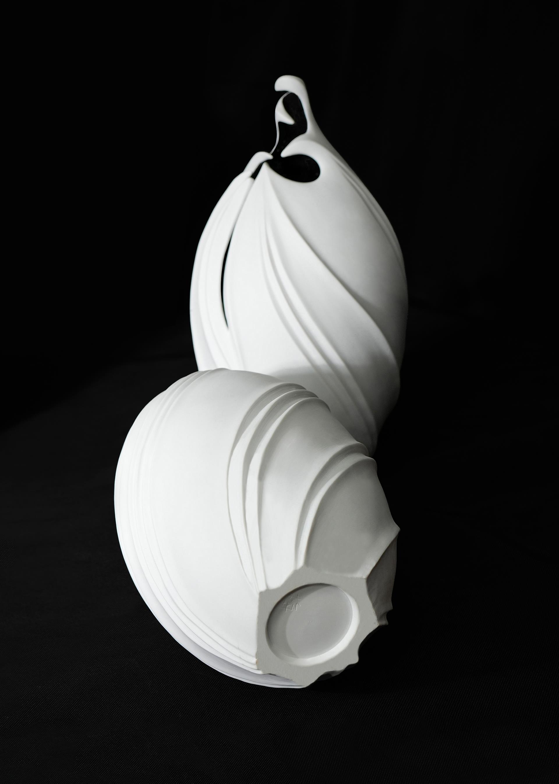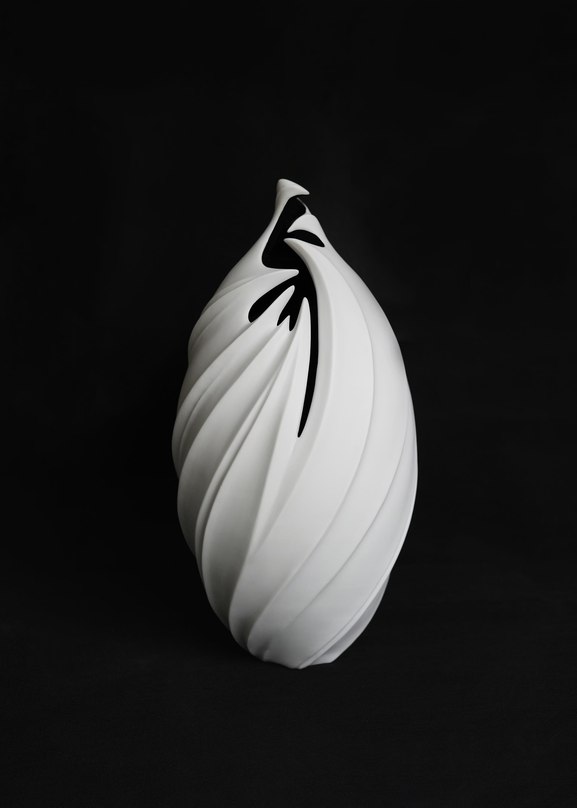 作品具有感性朴素的生命力,线条刚中带柔并齐,每组线条变化都淋漓尽致地得到了一种体现。这组作品头部用拟人的手法生动俏皮动人,作品挺拨而含蓄,刚劲而柔美,似行云流水的抒情,她有自身的纹理、韵律、涌动的节奏,她如同正要绽放的生命,具象或抽象塑造了一组生命符号的象征~作品块面与线条起伏的装饰和精雕细刻的方法却呈现简单,朴素,自然,自由与勃发的生命力最终用来体现所有惊喜之美。