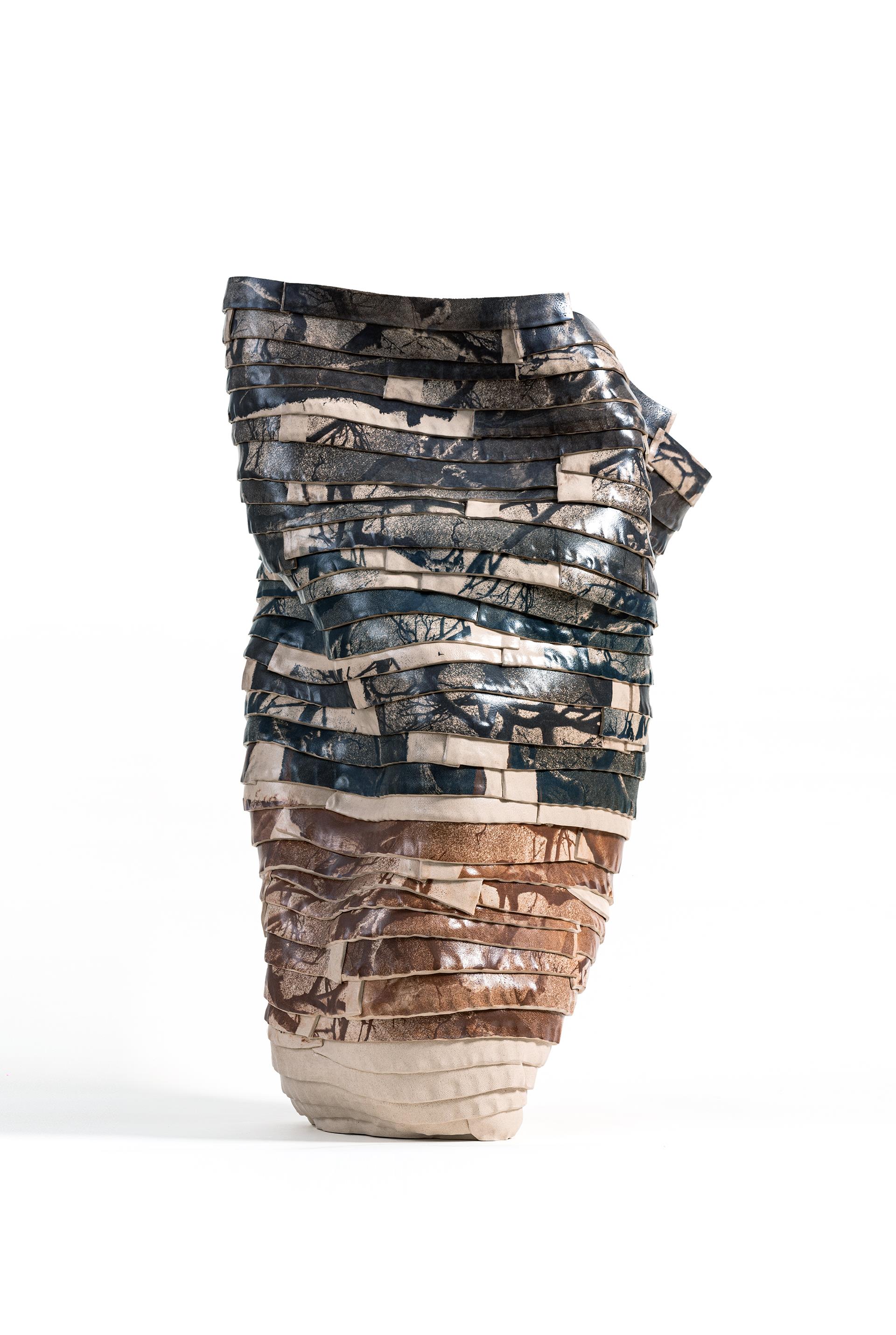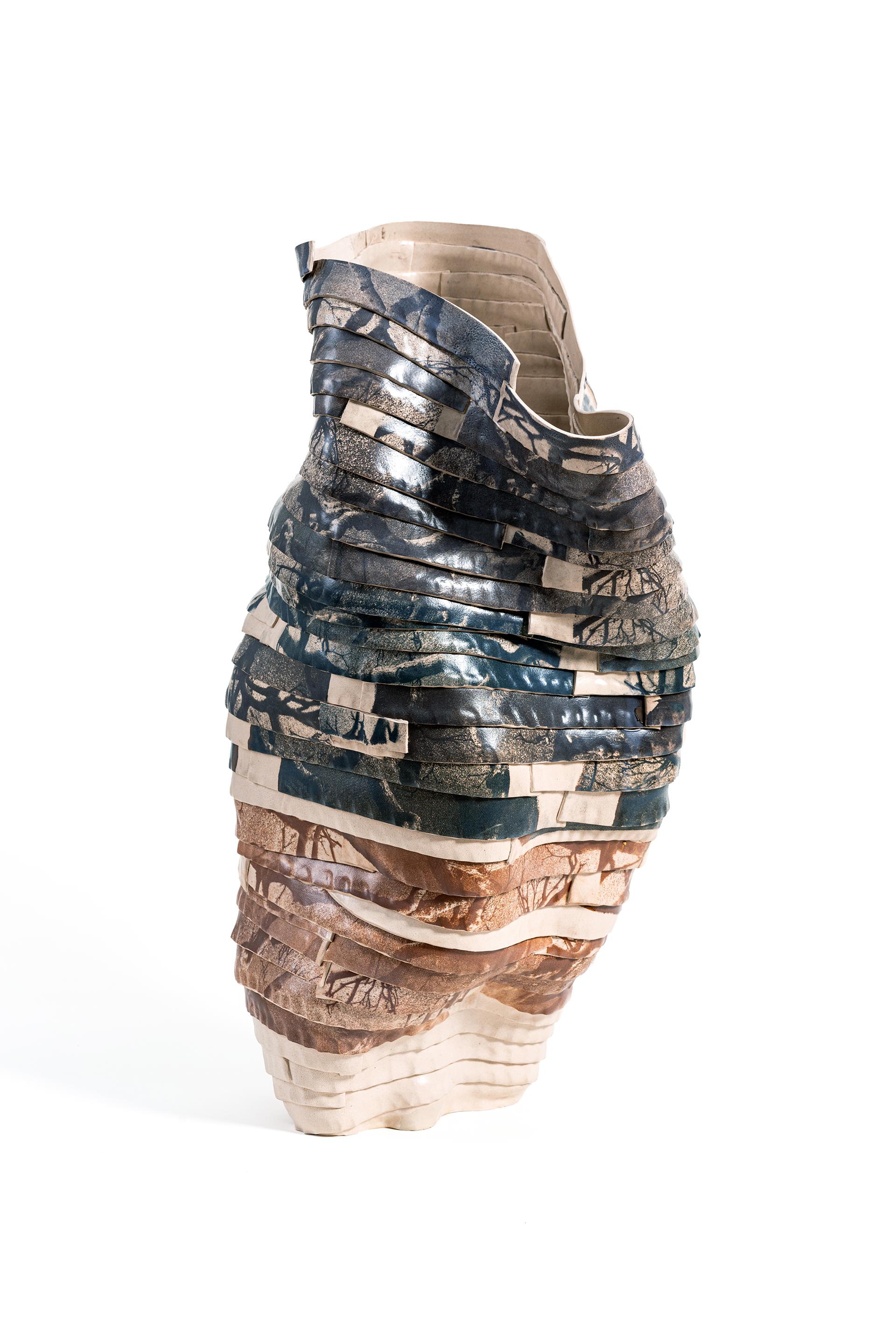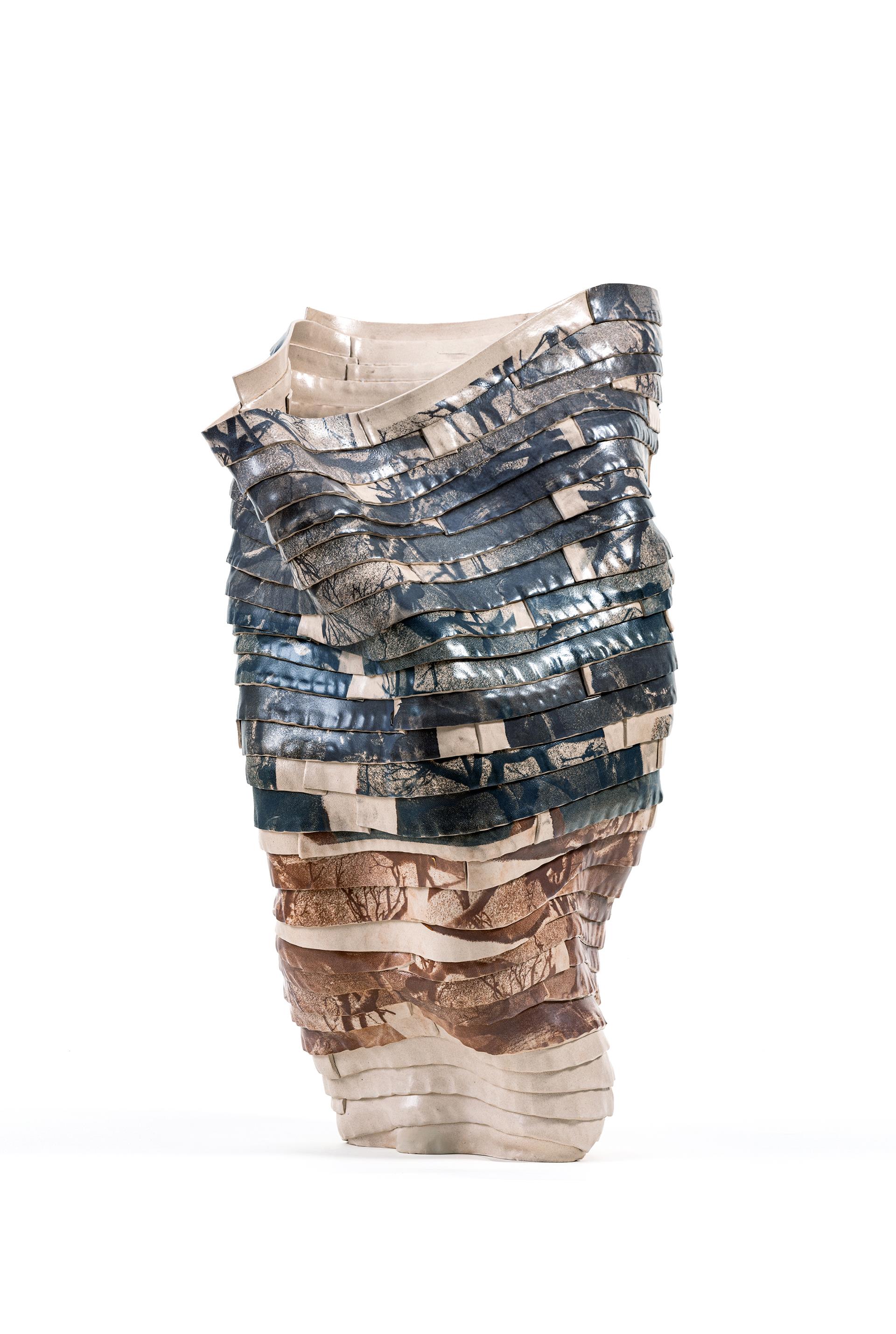 我的家乡重庆地貌十分独特,有爬不完的坡、上不尽的坎,还有蜿蜒的弯道、新旧建筑的交替以及起伏的地势。长江与嘉陵江就像在进行一场黄褐色与墨绿色的对话,正如您看到的这件作品,它上下两部分分为两种颜色——黄褐色代表长江,墨绿色代表嘉陵江。 长江和嘉陵江并非完全不相融,它们只是在交汇处(重庆朝天门)会出现短暂的“泾渭分明”现象。这主要是因为两条江的水情存在差异: • 泥沙含量不同:嘉陵江流经的区域多为黄土或沙质土壤,因此水流携带的泥沙较多,颜色偏黄;长江上游(此处指金沙江下段)的泥沙相对较少,水体更清澈。由于交汇处的密度差异,它们在短时间内难以完全混合,从而形成明显的界线。 • 流速和水量不同:两条江的流速与水量存在差异,交汇处水流动力的相互作用也会延缓混合速度。 不过,随着水流向下游推进,这一界线会逐渐消失,最终完全融为一体。 这件作品不规则的扭曲形态,象征着山城多雾多雨、崎岖陡峭且蜿蜒曲折的道路。悬崖峭壁上矗立着高楼大厦,看似是平层,实则已是二十多层。这里的地形奇特,景色壮丽。