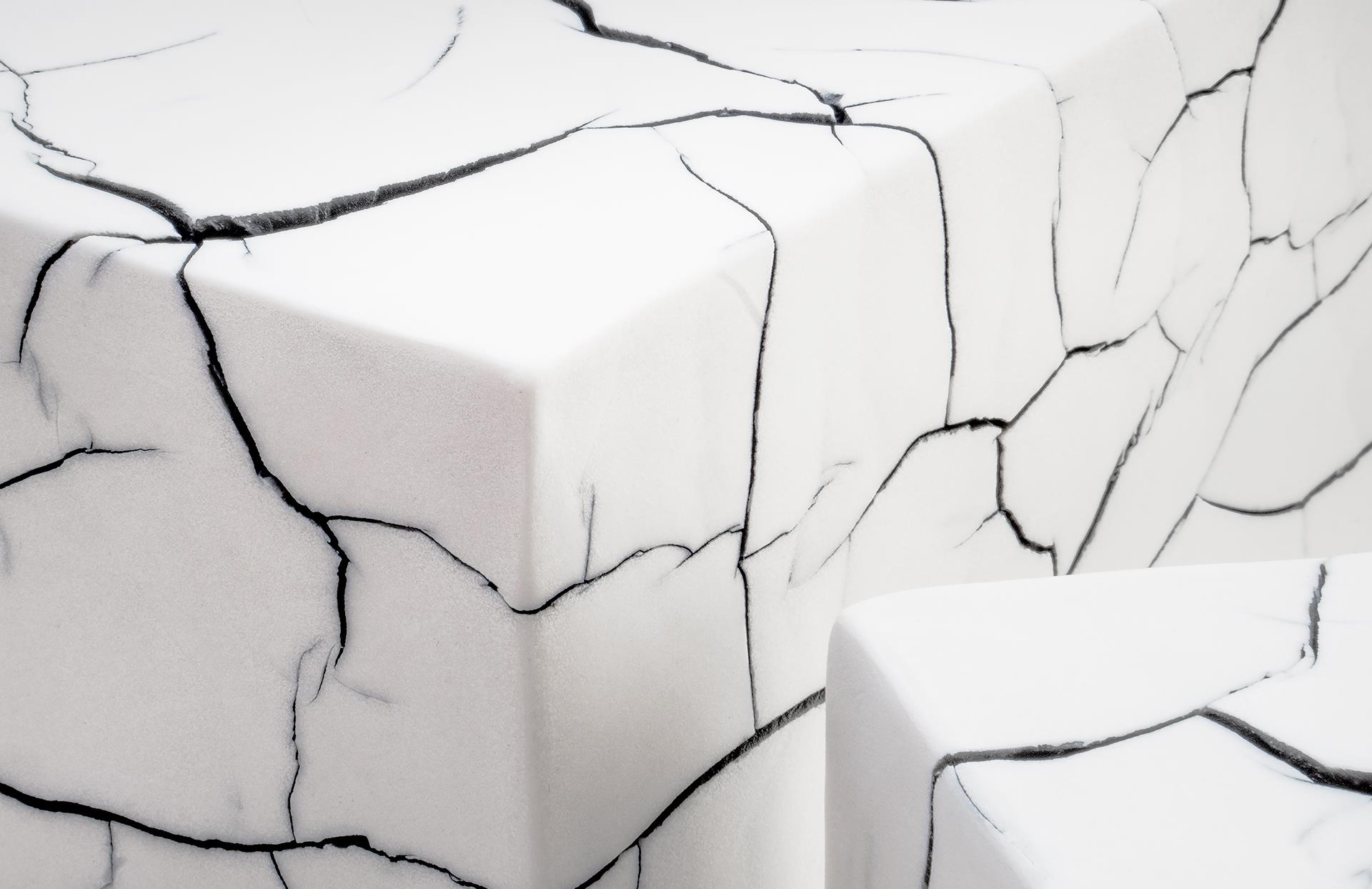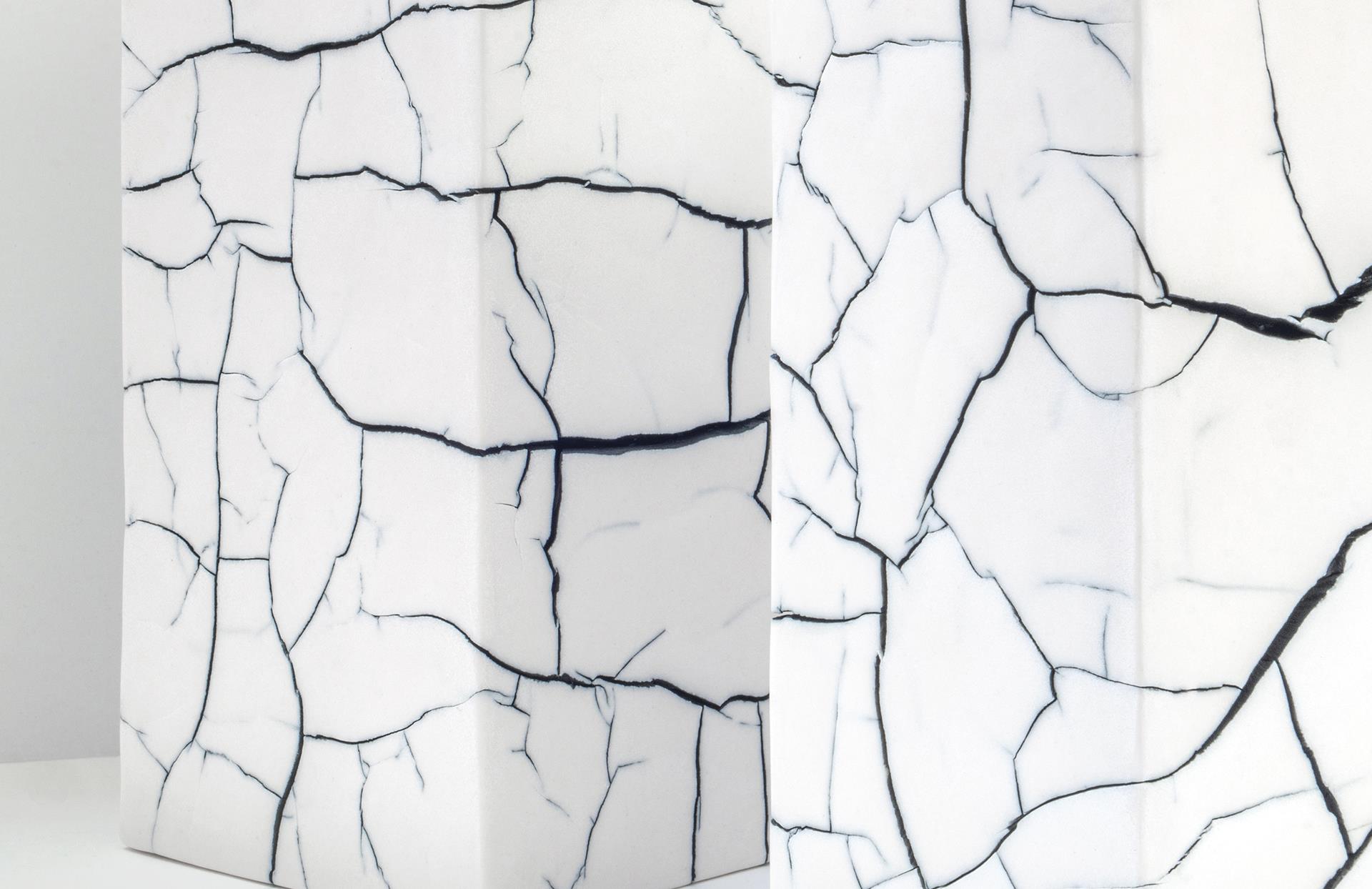 《时光的痕迹》探索了表层脆弱与内在力量间的静默张力。这些陶瓷作品灵感源于自然界的纹理与过程——干旱沙漠中龟裂的湖床、晶体的纯粹几何形态、波浪的律动轨迹,以及天体的缓慢运行。这些意象诉说着地质时间的层层流逝,以及悄然塑造周遭世界的韵律。 每件作品均采用白瓷精心制作,刻意营造出龟裂表面,唤起人们对侵蚀、沉积及物质缓慢转化的联想。尽管外观纤弱,其形态却完全玻璃化——稳定、持久且坚韧。视觉的纤巧与材质的坚韧形成鲜明对比,正是作品的核心所在。两件作品被构思为一场对话——各自独立,却又紧密相连。它们的关系唤起自然界中对立力量间的对话:光与影、动与静、堆积与侵蚀。并置时,它们暗示着某种平衡,呼应自然界中静谧的韵律与微妙的张力。作品邀请观者端详并沉思。其静默的存在感传递出一种能量凝滞的状态——仿佛形态正处于生成之中,或正缓缓回归大地。通过力量与脆弱、永恒与无常的交织,作品促使我们更深刻地感知那些常被忽视的力量:时间、重力与自然变迁。